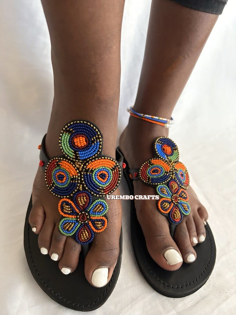 Product Name: Handmade Beaded Leather Sandals – Heart Design Brand: Urembo Crafts Product Description: Step into elegance and culture with these Handmade Beaded Leather Sandals from Urembo Crafts. Skillfully crafted by local artisans, these sandals feature a stunning heart-shaped beadwork design in vibrant multicolor patterns, representing African heritage and style. Each pair is made using high-quality, durable leather for long-lasting comfort and support. The intricate beadwork is carefully hand-stitched to ensure uniqueness and attention to detail, making every sandal one of a kind. Perfect for casual wear, beach outings, summer events, or adding a touch of tradition to your modern look. Key Features: 100% genuine leather sole and straps Beautiful multicolored heart-shaped bead design Soft and comfortable inner lining for all-day wear Handmade by skilled Kenyan artisans Available in various sizes Lightweight and flexible for everyday comfort Care Instructions: Wipe clean with a soft, damp cloth Avoid prolonged exposure to water