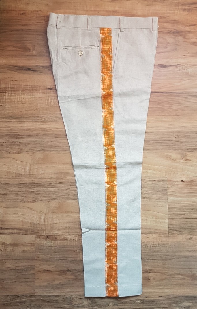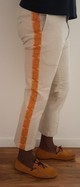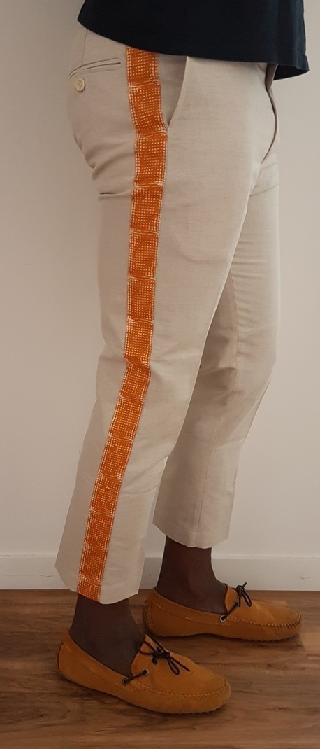 Pantalon beige en lin avec une bande en wax sur le côté.