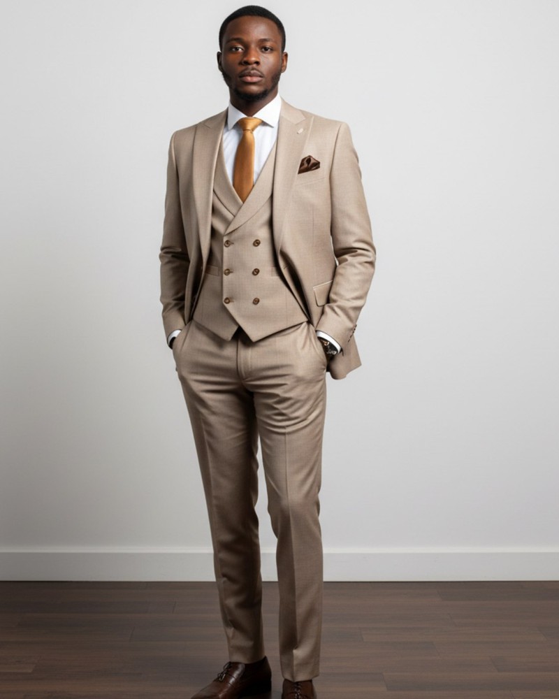 Step into elegance with this beige three-piece suit, featuring a tailored jacket, double-breasted waistcoat, and matching trousers. The warm neutral tone pairs effortlessly with a white shirt and golden tie, creating a refined and versatile ensemble. Perfect for weddings, formal celebrations, or upscale social events, this suit defines modern gentleman style.