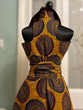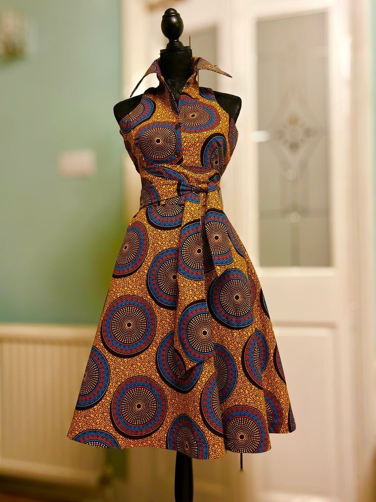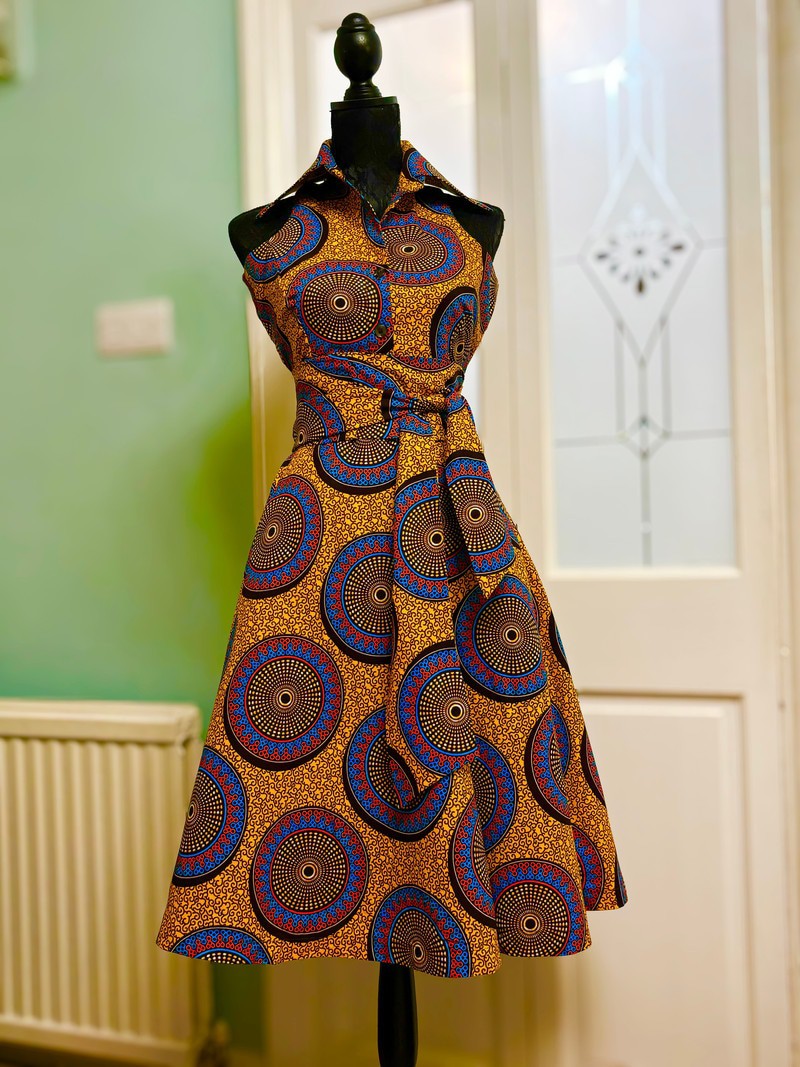 A tailored timeless halter A line collared dress in a contemporary African print in earthy hues. It has a wide belt in the same fabric and closure is with a back zip. Dress up for a specially occasion with your favourite outing shoes or for a smart casual look rock with pumps or trainers. This could also be worn with boots in the colder months then throw on your cardigan, coat or leather jacket with a scarf. It is fully lined. 100% Cotton.