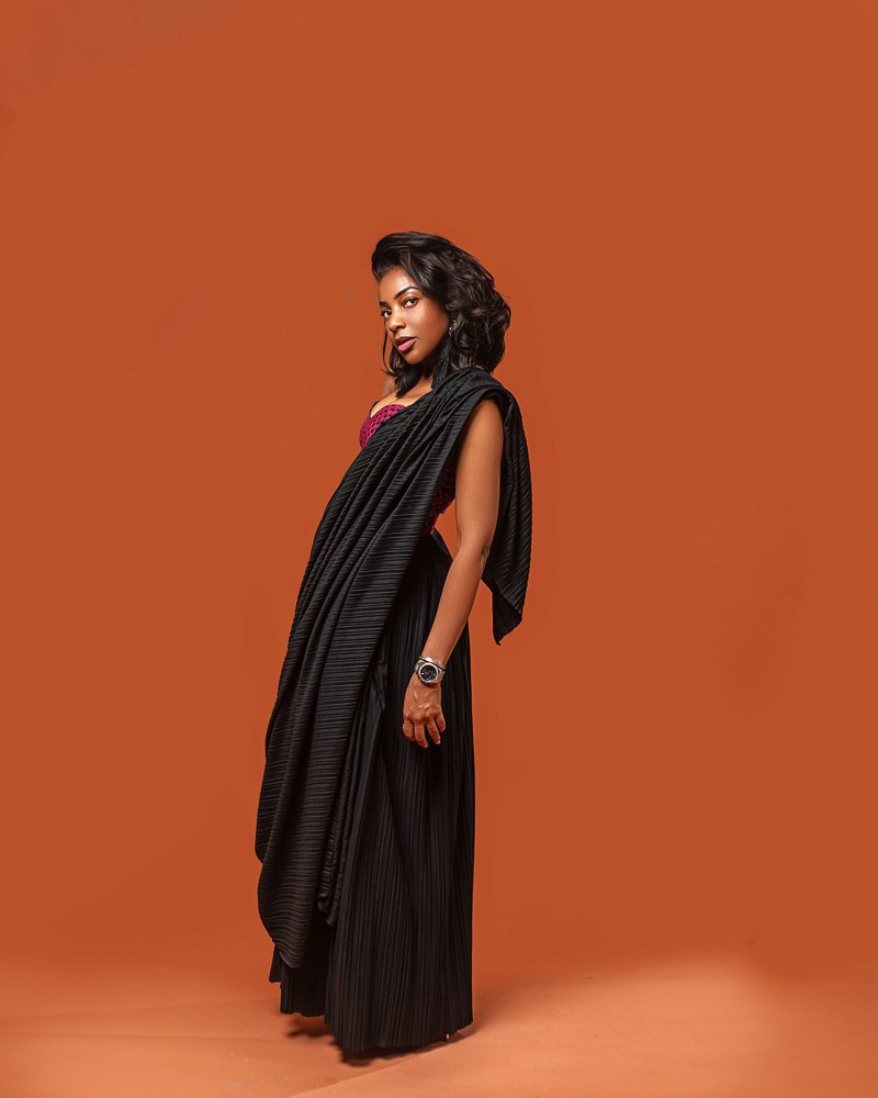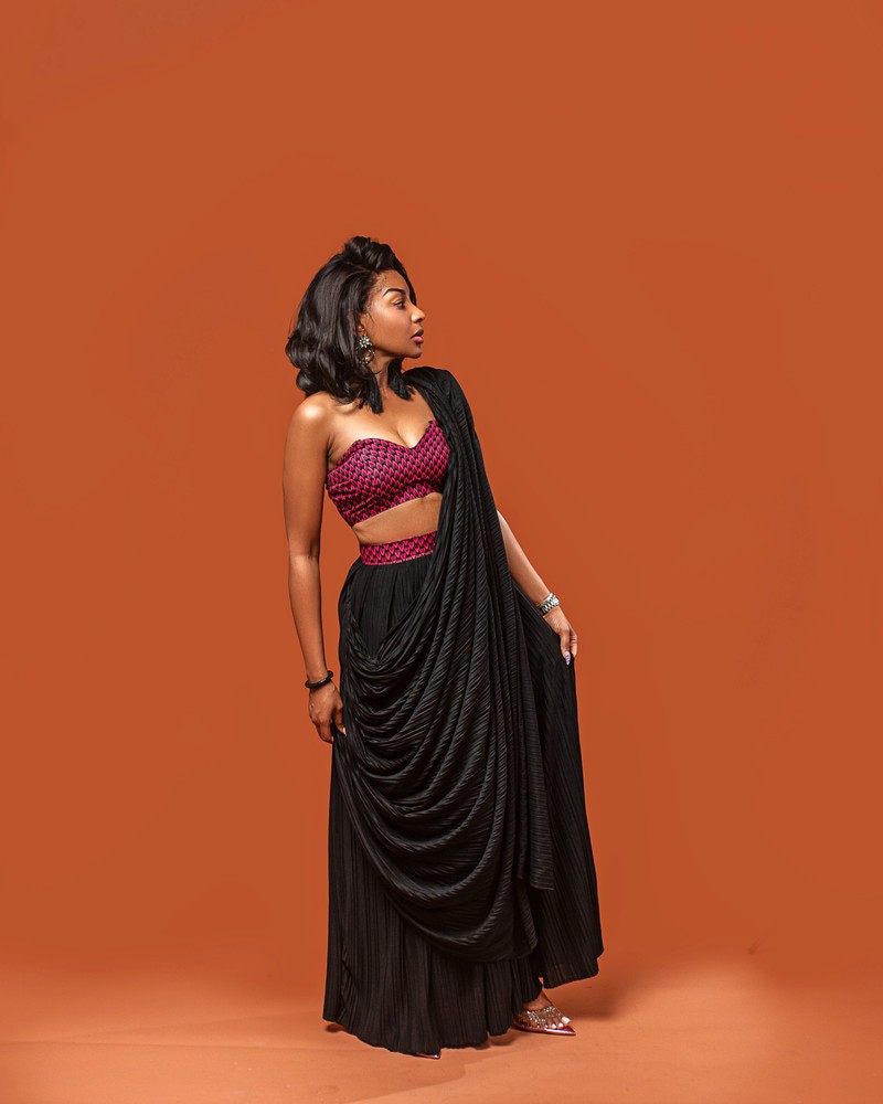 Ensemble deux pièces doté d'un sari en crepe et d'un mini bustier en wax. Se porte idéalement durant les beaux jours et pour des cérémonies à themes culturelles