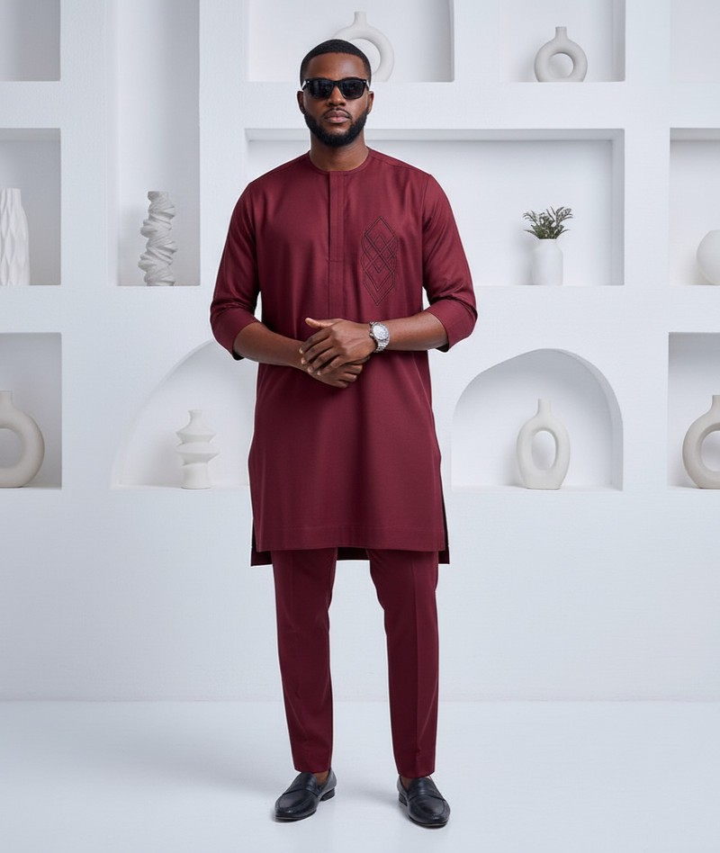 Elevate your style with this premium men's senator set, designed with a modern, relaxed silhouette that blends elegance and comfort. The top features a 3-quarter length cut with a smooth round neckline and a clean front placket, offering a refined and timeless look. A subtle embroidery detail on the chest enhances the outfit with a touch of sophistication. Paired with matching straight-cut trousers, this set delivers a polished appearance suitable for weddings, celebrations, office functions, church, and stylish everyday wear. Crafted from high-quality fabric for durability and a luxurious feel, this outfit is perfect for men who appreciate premium tailoring and effortless class. Color: Burgundy/wine Material: High-quality premium fabric (breathable & durable) Top Style: 3-quarter length senator kaftan (relaxed fit) Trousers: Straight-cut, comfortable fit Embroidery: Subtle chest embroidery Sleeve Length: 3/4 sleeve Neckline: Round neck with front placket Fit: Tailored but not slim-fit Design Style: Modern, minimal, elegant Occasion: – Weddings – Traditional ceremonies – Office events – Church – Casual luxury outings – Celebrations & parties Package Includes: Top + Trousers Custom-Made (Send Your Measurements) For a perfect tailored fit, customers can send their measurements. Please provide: Neck Shoulder to Shoulder Chest Stomach / Midsection Waist Hips Top Length Sleeve Length (3/4 or Full, depending on preference) Biceps / Arm Round Wrist (if applicable) Trousers Length Thigh Knee Ankle Inseam