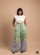This contemporary two-piece ensemble features a crisp white, sleeveless cropped bodice with a gathered hem and structured shoulders, paired with high-waisted, wide-leg trousers that showcase a striking mix of artisanal prints. The trousers are expertly crafted from premium hand-dyed batik cotton, offering a breathable and structured feel that ensures comfort and a flattering silhouette. The design highlights a vibrant green stone-like abstract motif on the upper portion of the pants, which transitions into a sophisticated blue and white striped border at the hem for a modern, architectural finish. This versatile outfit is an ideal choice for upscale weekend brunches, creative professional events, or sophisticated coastal getaways where you want to project an image of effortless, modern elegance.