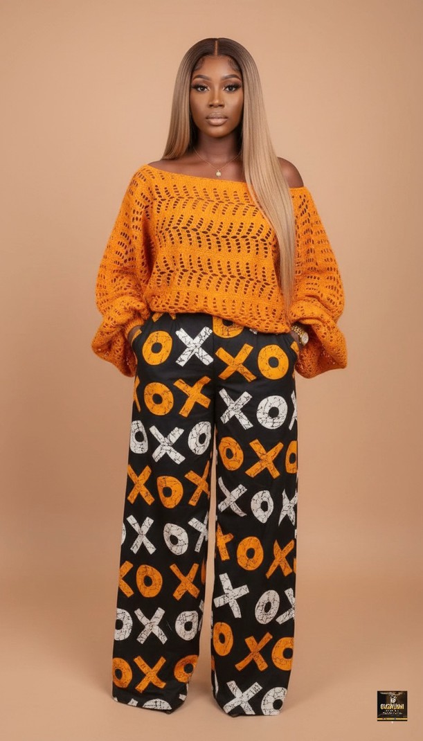 This eye-catching two-piece set is expertly crafted from premium hand-dyed Adire fabric, featuring a bold "X" and "O" motif in a vibrant yellow, white, and charcoal black palette. The ensemble pairs high-waisted, wide-leg trousers with a cozy, mustard-yellow textured lace blouse that boasts an elegant off-the-shoulder neckline and voluminous balloon sleeves. This outfit seamlessly blends traditional West African textile artistry with contemporary fabrics. It is an ideal choice for stylish autumn luncheons, creative office environments, or sophisticated weekend gallery hops where you want to make a unique, culturally-inspired statement.