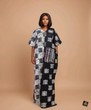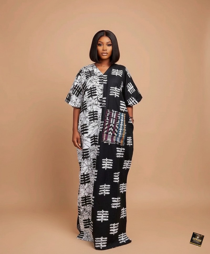 This striking monochrome maxi Bubu dress is a sophisticated exploration of contrast and heritage, expertly handcrafted from authentic, high-quality Adire cotton that ensures both durability and a lightweight, breathable feel. The garment features a bold split-panel design, juxtaposing deep obsidian black with crisp ivory white, and is adorned with intricate, hand-stamped traditional motifs that include sunbursts and geometric line work. Designed with a flattering V-neckline and relaxed, wide-cut sleeves, the fluid silhouette offers an effortless drape that prioritizes comfort without sacrificing high-fashion appeal. This versatile piece is the perfect ensemble for gallery openings, sophisticated weekend brunches, or elevated resort wear, providing a timeless look that celebrates artisanal craftsmanship.
