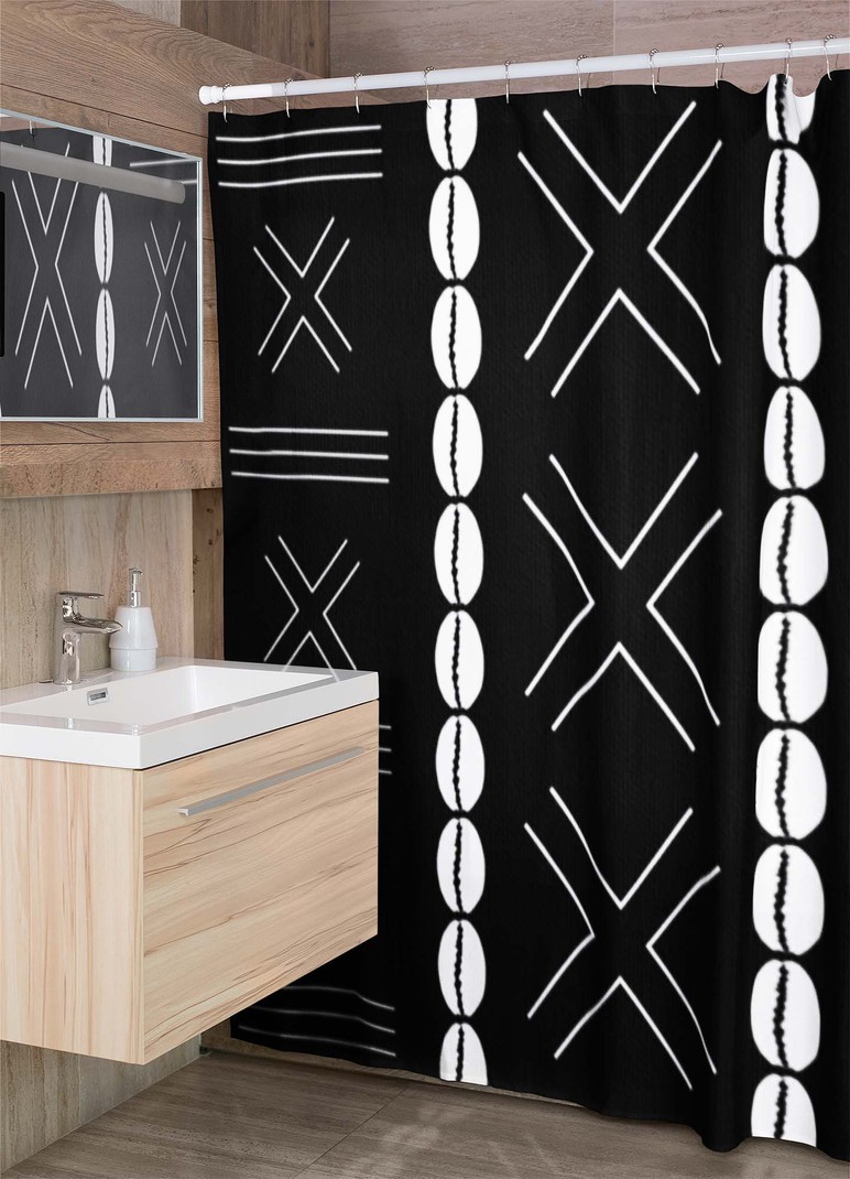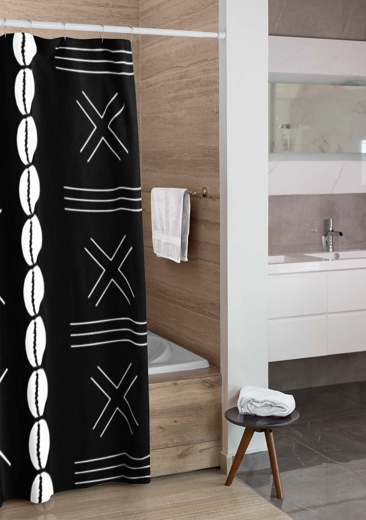 Elevate your bathroom decor with our Black and White Tribal Shower Curtain. Featuring a bold African Cowrie print, this curtain adds a touch of adventure and risk to any space. Experience the empowering feeling of taking a bold step in your home design.