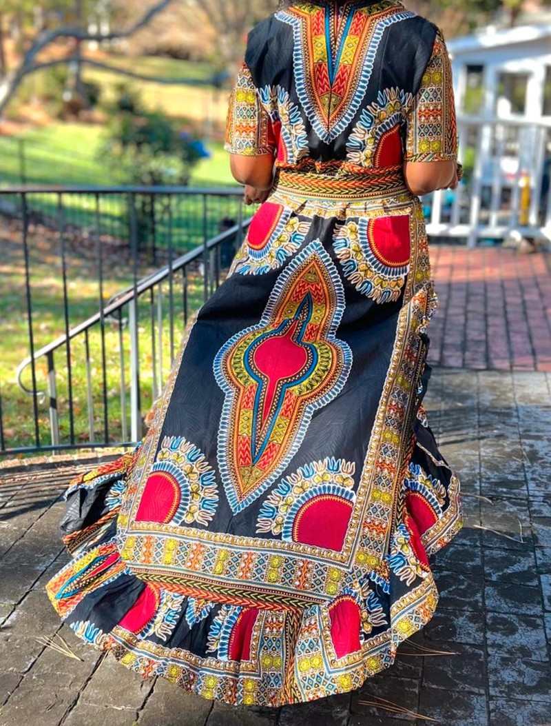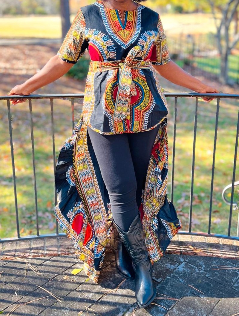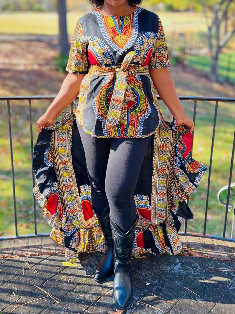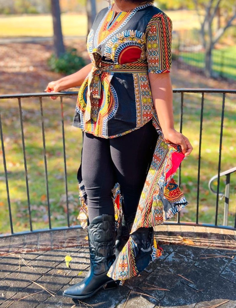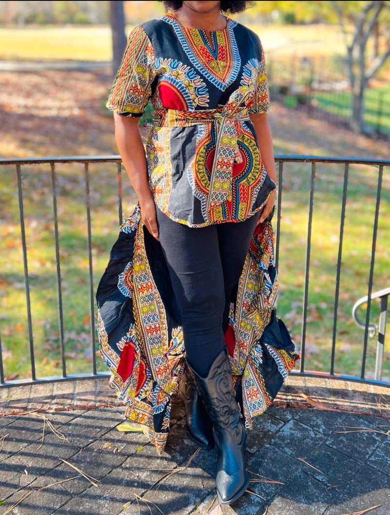 Black Multicolor Dashiki Print Ankara High Low Ruffle Peplum Blouse made with 100% cotton ankara fabric. Material: Cotton Color: Multicolor Pattern Type: Ankara Fabric: Fabric has no stretch Care Instructions: Machine Wash and Air Dry/Dry Clean