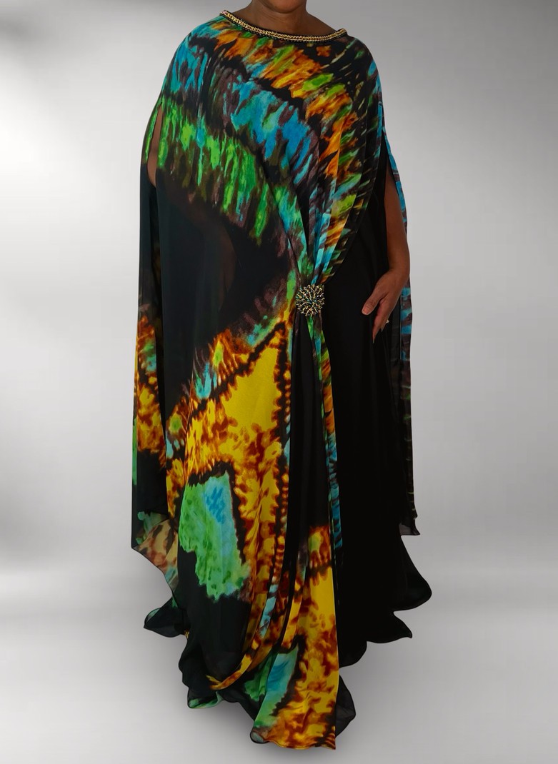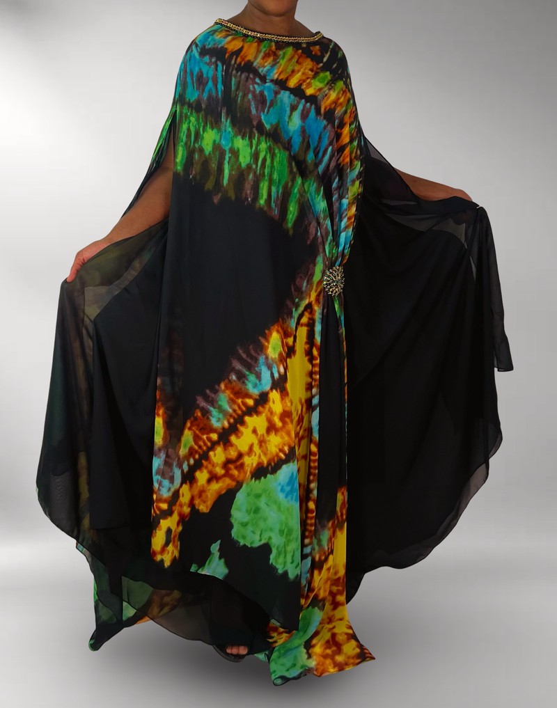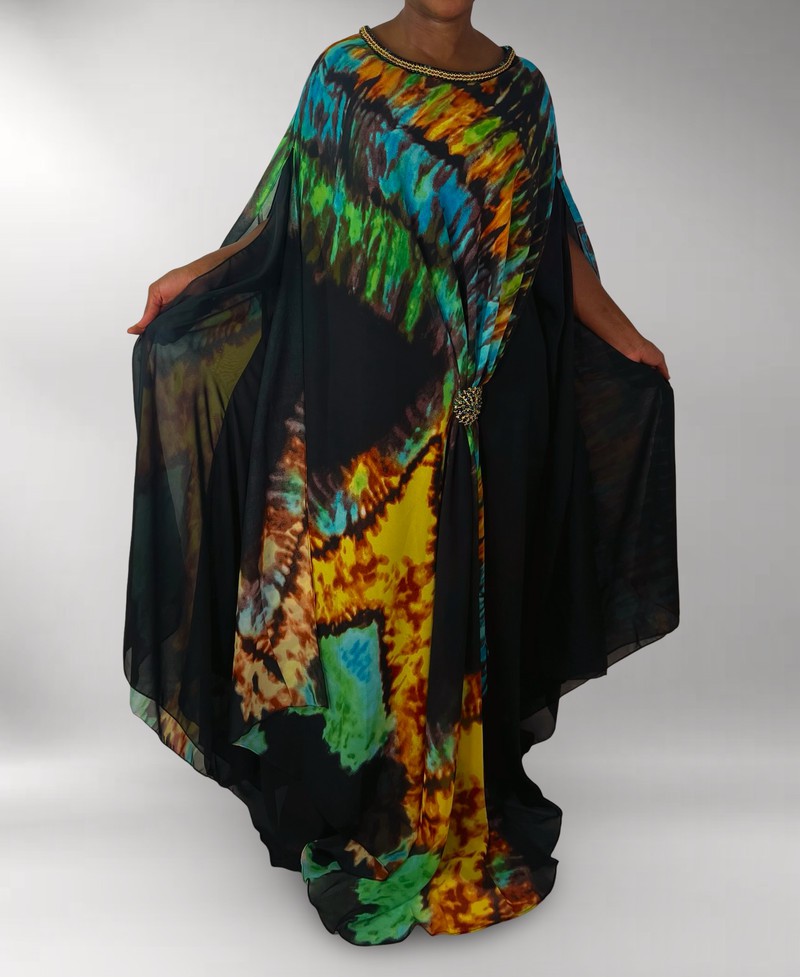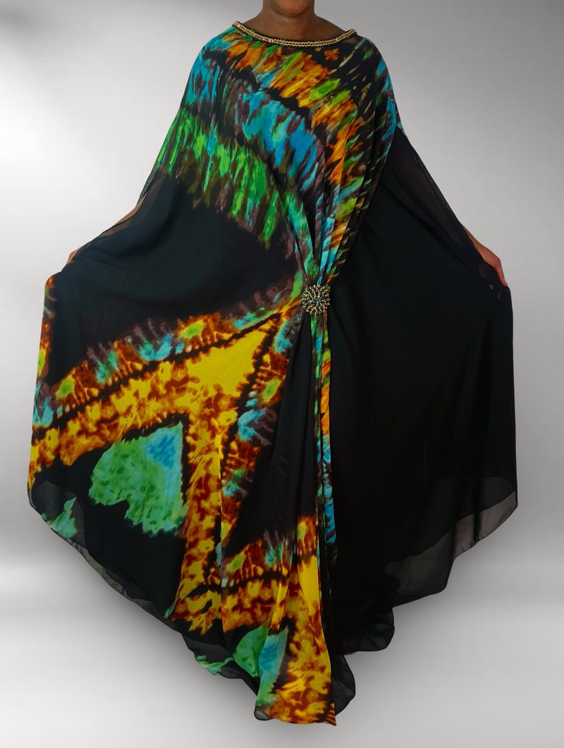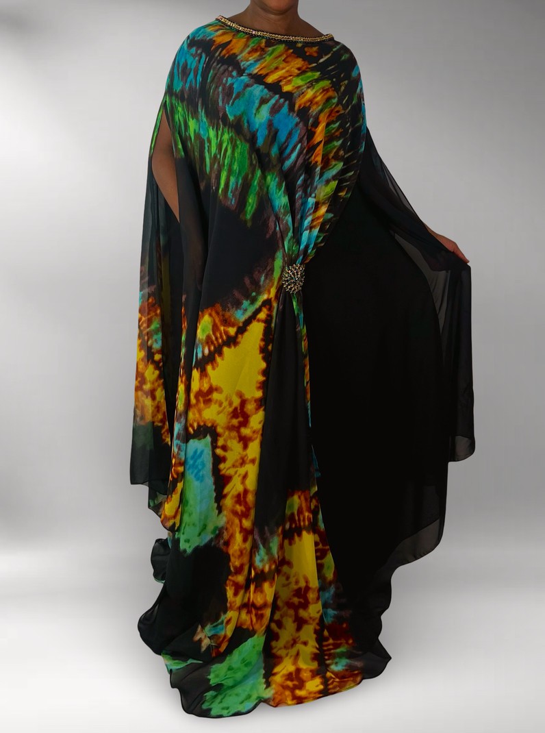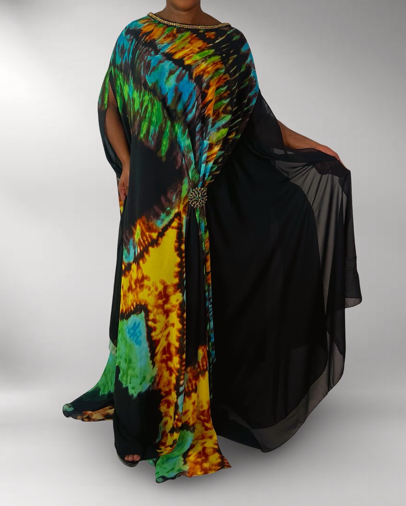Black Multicolor Sheer Chiffon Flowy Maxi Dress with Beaded Neckline