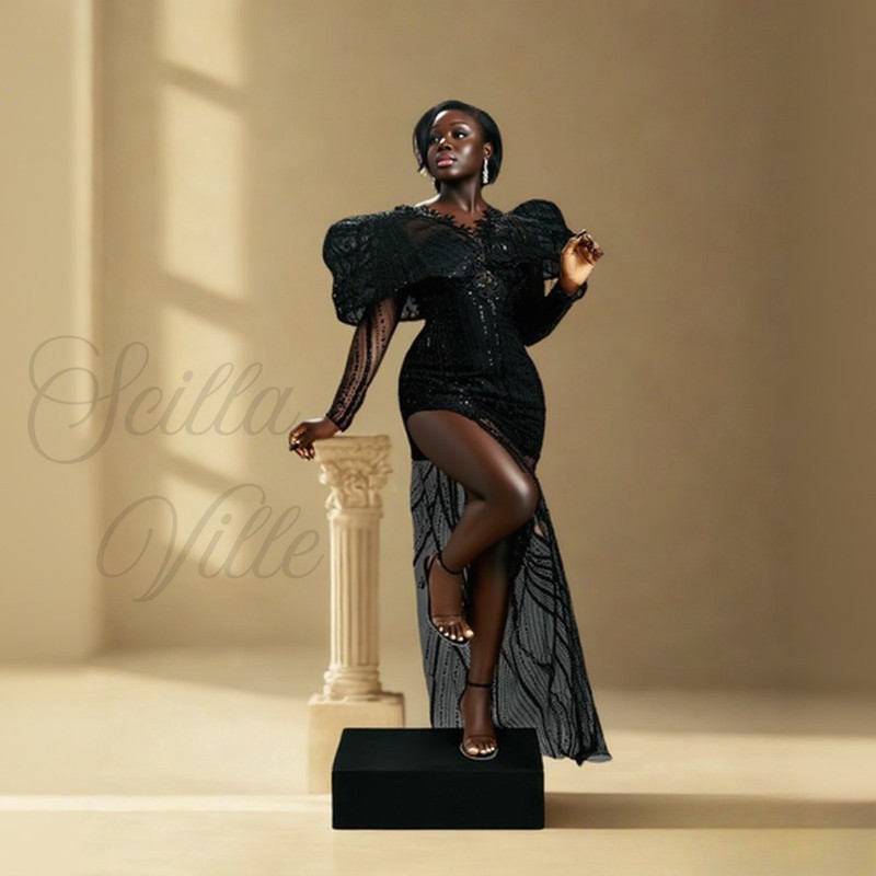 This is THE statement dress. Beaded lace, exaggerated structured sleeves, quality lining, skin colored mesh, beaded applique, and high slits - these are all the qualities that made this a statement dress. The dress is made with high quality beaded lace,and skin mesh which is on the back part of the bodice and chest area, the chest area is then covered with beaded appliques. It can be worn to different occasions like prom, wedding, dinner, birthday shoot, birthday parties and so on. You'll definitely make a statement in this dress.