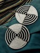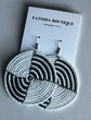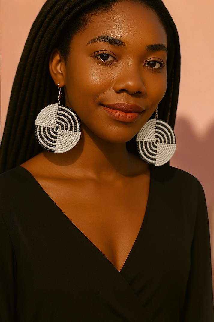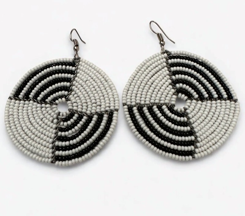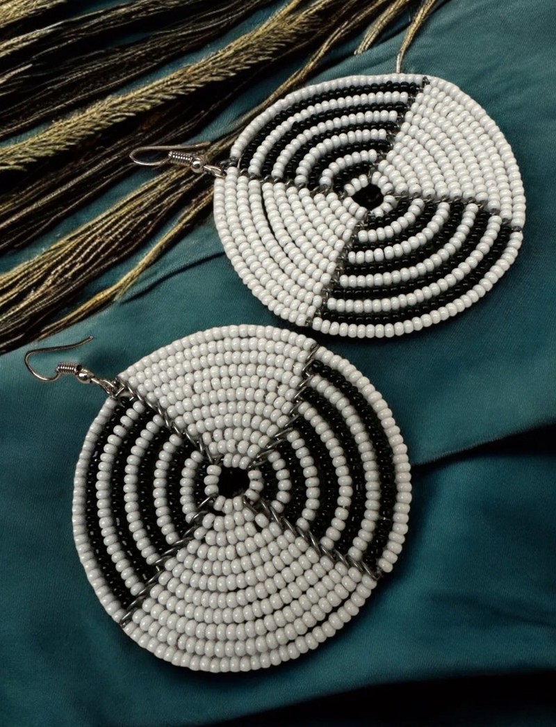 Silhouette with a black and white spiral beadwork design, handcrafted by skilled African artisans. The pattern represents balance and unity, echoing traditional African symbolism in a bold, monochrome palette. Ideal for cultural wear, statement styling, or minimalist Afrocentric fashion, these earrings are lightweight, sophisticated, and timeless. Their neutral tone makes them highly versatile while retaining strong ethnic identity and artisanal charm.