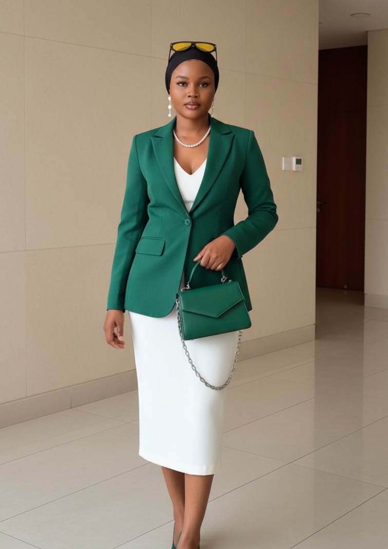 Radiate sophistication with this emerald green blazer and white midi gown ensemble. The fitted single-button blazer enhances your shape, while the sleek white gown adds a clean, polished contrast. Perfect for the modern woman, this outfit transitions seamlessly from boardroom to social events. Pair with matching green heels and a structured handbag for a refined, professional finish.