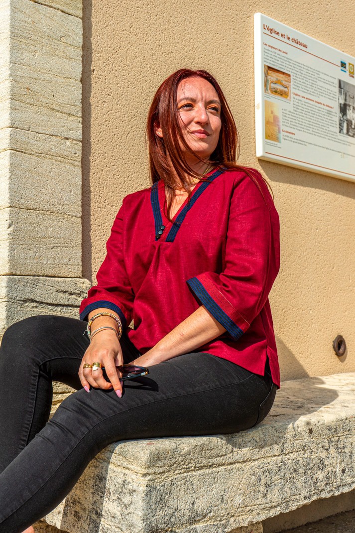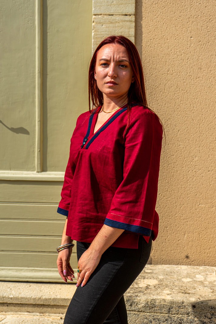 Coupe ample et aérienne, manches ¾ soulignées d’un délicat galon tissé main.