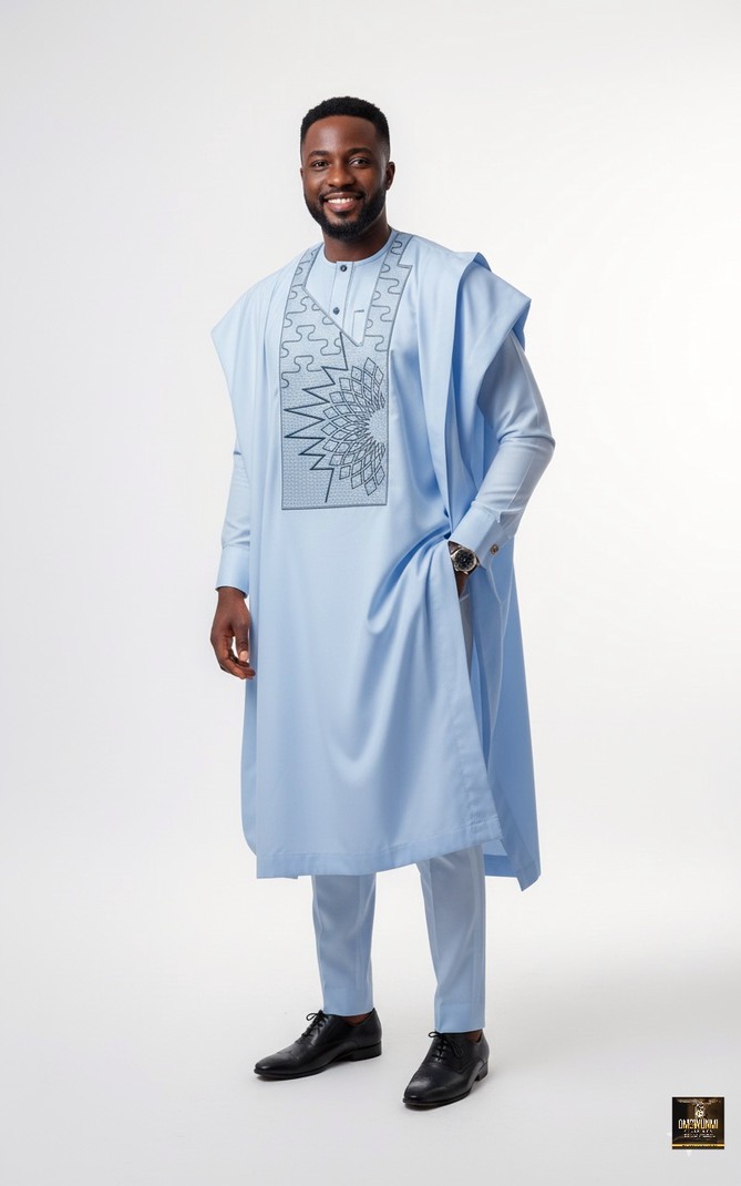 Make a bold statement with this luxury Blue agbada set, a perfect blend of tradition and modern sophistication. Expertly tailored from premium quality fabric, this three-piece outfit includes a long embroidered agbada robe, a matching inner top, and well-fitted trousers. The detailed embroidery adds a regal touch, making it ideal for weddings, traditional ceremonies, and special occasions. This outfit represents the essence of African men's fashion, offering both elegance and comfort for the stylish gentleman. Premium-quality, breathable fabric Exquisite embroidery detailing Comfortable tailored fit Suitable for weddings, engagements, and cultural events Style Tip: Complete the look with loafers or leather sandals and a matching cap for a royal appearance.