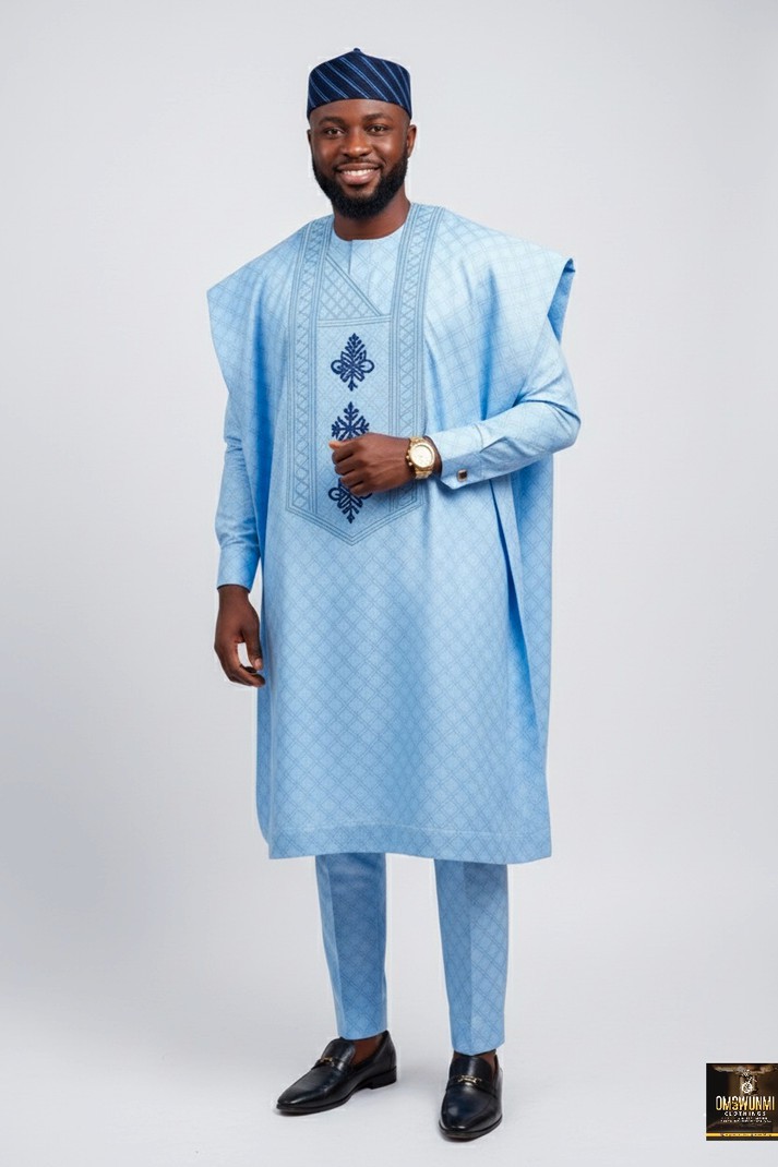 Make a bold statement with this luxury blue agbada set, a perfect blend of tradition and modern sophistication. Expertly tailored from premium quality fabric, this three-piece outfit includes a long embroidered agbada robe, a matching inner top, and well-fitted trousers. The detailed embroidery adds a regal touch, making it ideal for weddings, traditional ceremonies, and special occasions. This outfit represents the essence of African men's fashion, offering both elegance and comfort for the stylish gentleman. Premium-quality, breathable fabric Exquisite embroidery detailing Comfortable tailored fit Suitable for weddings, engagements, and cultural events Style Tip: Complete the look with loafers or leather sandals and a matching cap for a royal appearance.