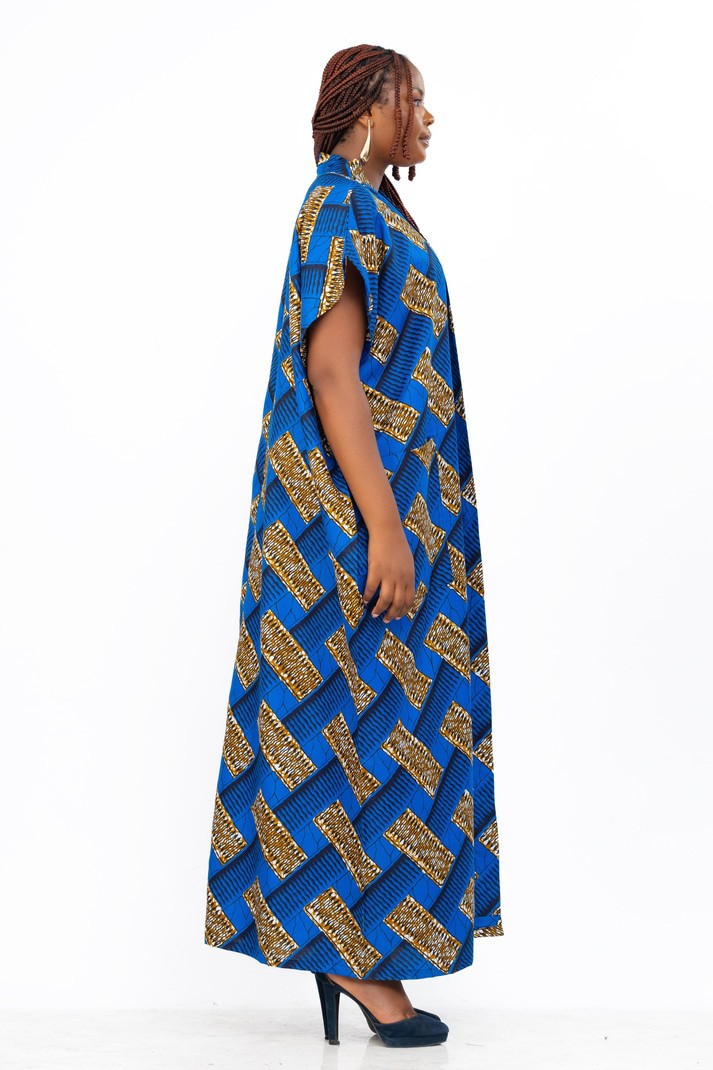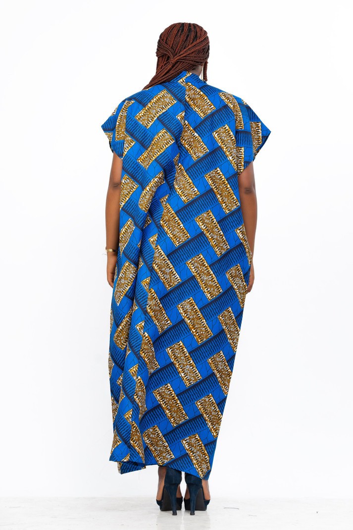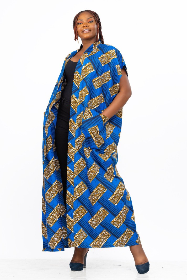This beautiful kimono is made from Ankara Print fabric which is made of African wax print fabric. The kimono is long and very big giving a cool oversize look. The colors are a wonderful blend of natural blue tones. This kimono can be worn with an inner dress of with trousers and a tank top for a more funky look. This kimono is very versatile and can be worn with so many different clothes. It is a free size and will fit women from UK 8 to 22. The kimono is also very long.