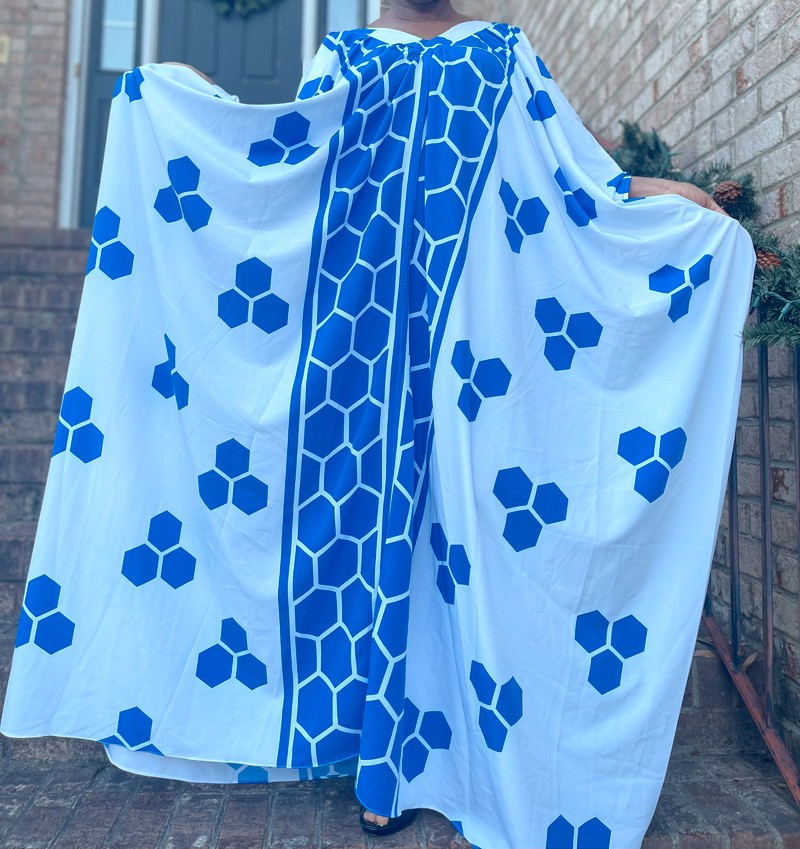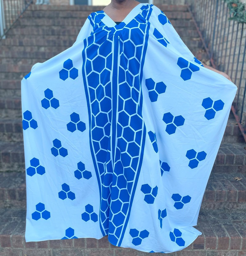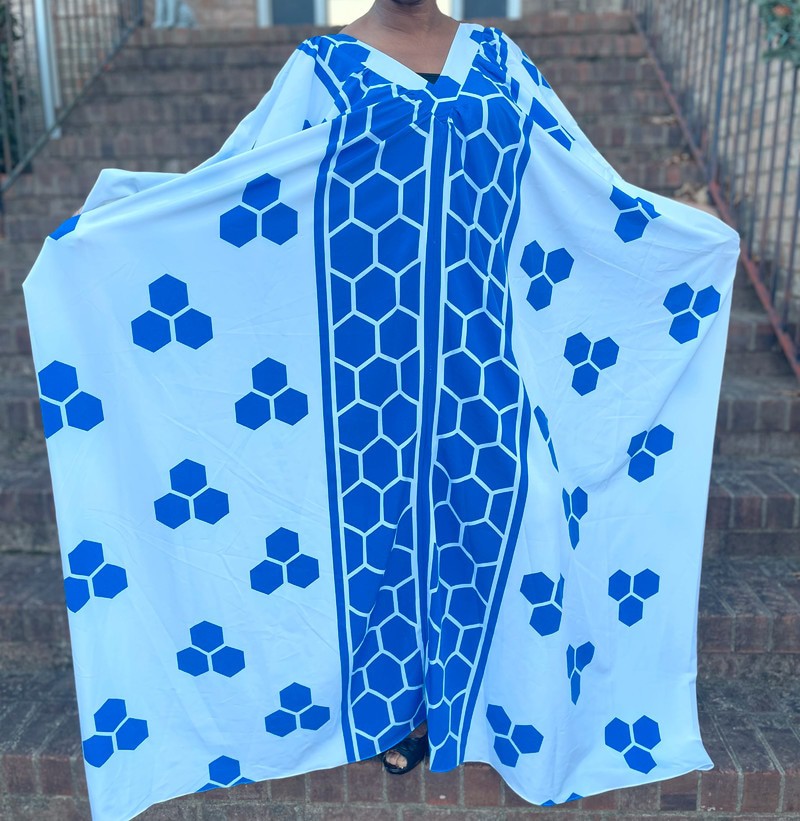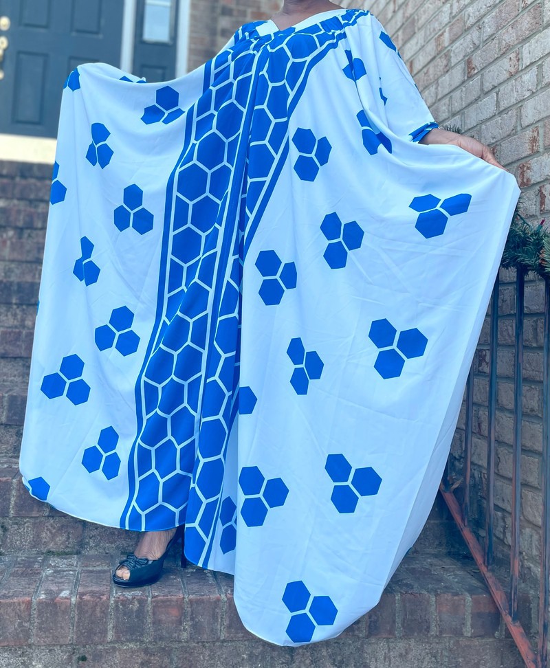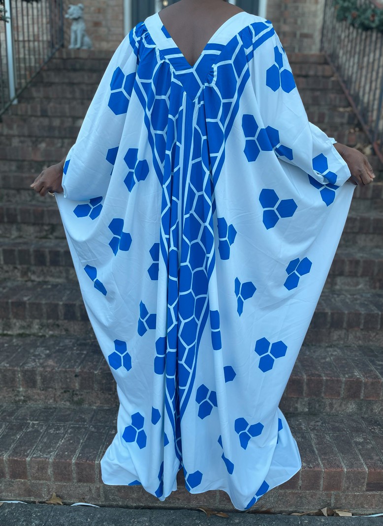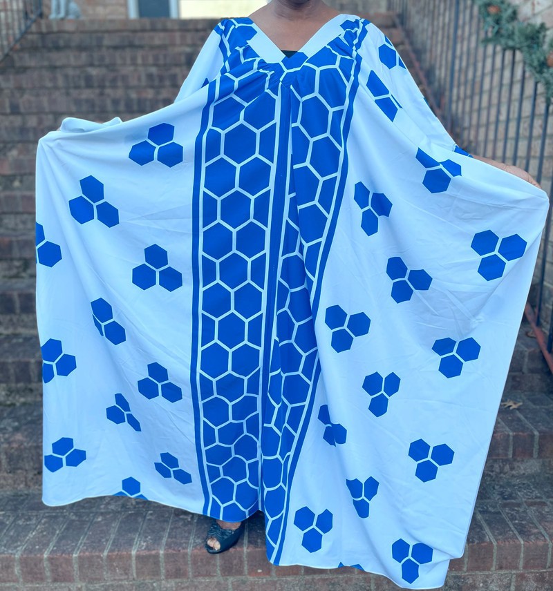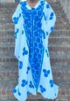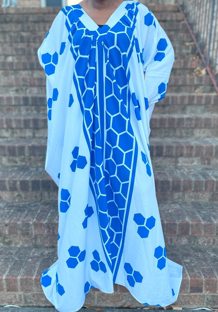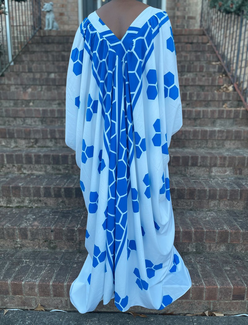 Blue and white geometric print v-neck maxi oversized kaftan dress