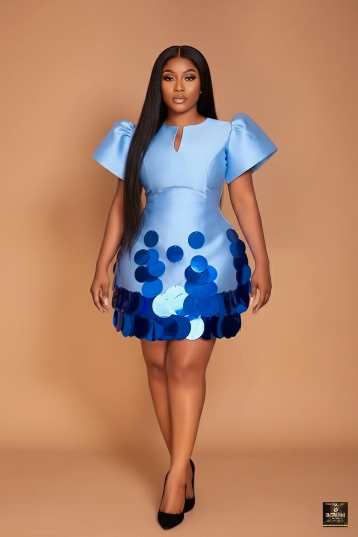 A breath of fresh air, this stunning baby-blue mini dress is the definition of sweet glamour. It features beautiful voluminous, structured cap sleeves and a subtle keyhole detail at the neckline. The fitted bodice flows into a flared skirt that is heavily adorned with a spectrum of blue circular sequins, creating incredible depth and texture. An enchanting piece for weddings, bridal showers, or celebratory cocktails. Material: SatinColor: Blue
