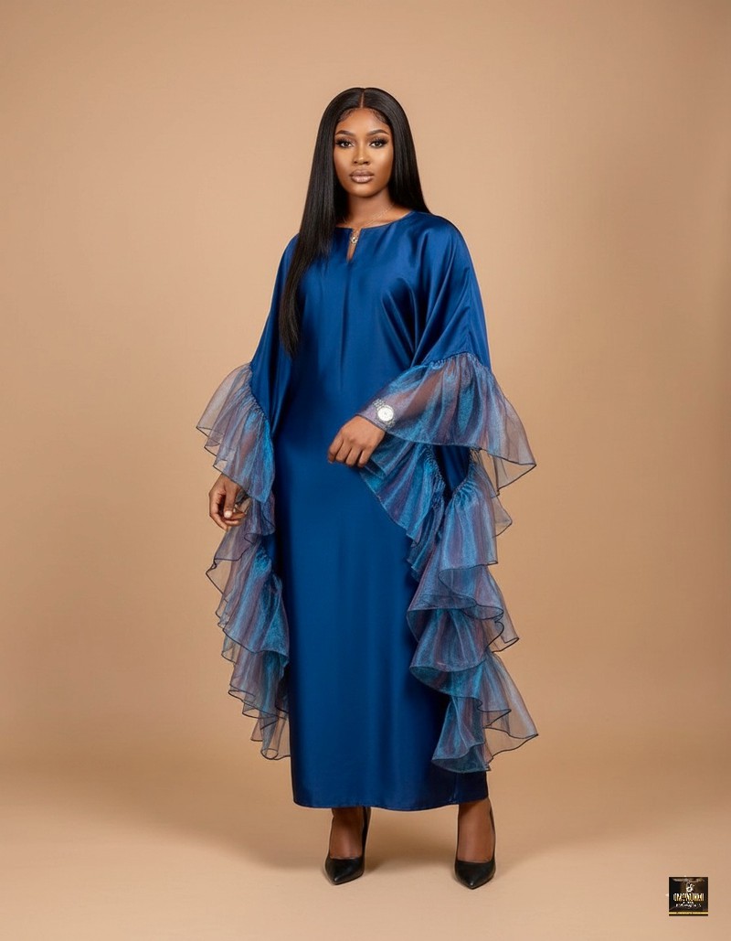 Command the room in this regal Blue Shift Dress. Crafted from lustrous satin-finish fabric, this piece is defined by its dramatic, architectural sleeves. Cascading layers of iridescent, sheer organza ruffles run down the sides, creating an ethereal "angel wing" effect. The loose, comfortable fit ensures you look effortlessly glamorous without compromising on comfort.