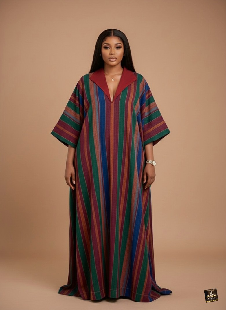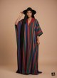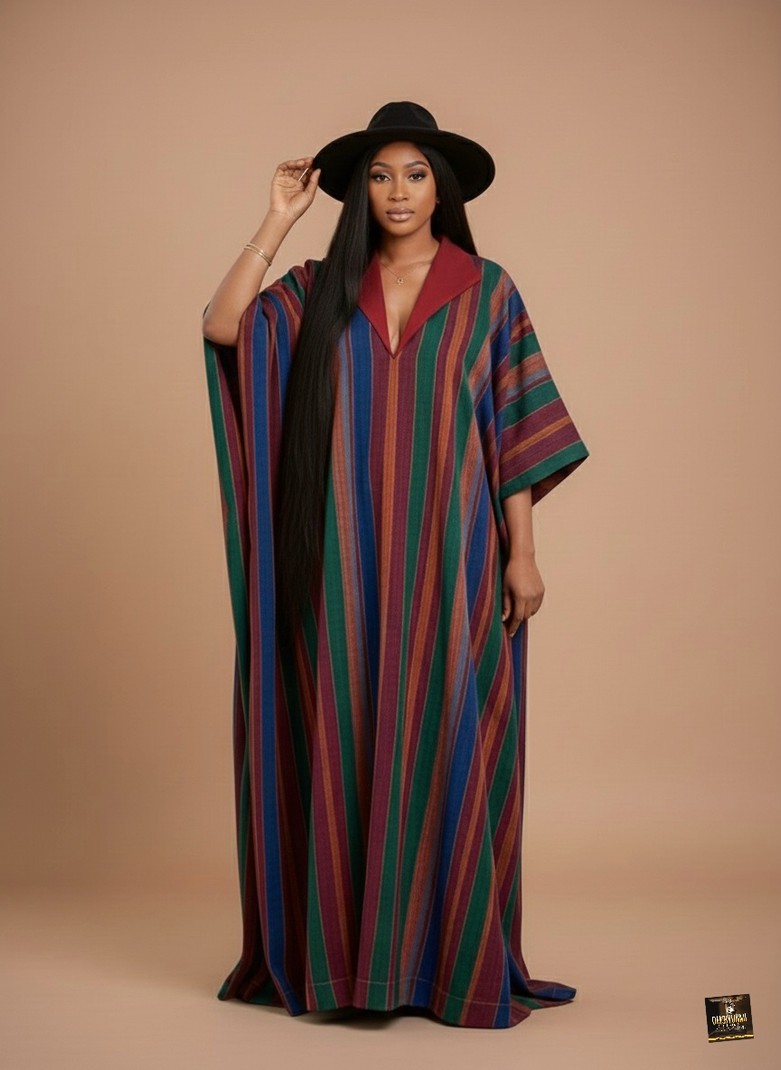 This striking, full-length kaftan dress is a masterpiece of vibrant, vertical stripes, blending rich shades of maroon, forest green, royal blue, and burnt orange for a visually arresting effect. The garment features an incredibly relaxed and flowing silhouette, offering both comfort and dramatic style. It is elevated by a sophisticated V-neckline framed with a contrasting, solid-colored collar, a deep burgundy that adds a structured focal point to the wide, voluminous drape. The loose, kimono-style sleeves maintain the dress's breezy elegance, while the overall design exudes a luxurious, global-chic aesthetic, perfectly suited for upscale events, art gallery visits, or resort wear when accessorized with a wide-brimmed hat as shown.