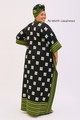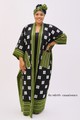 This elegant boubou is made from a refined blend of two traditional African fabrics: green striped Aso Oke for the edges, and black Kampala fabric with white patterns.