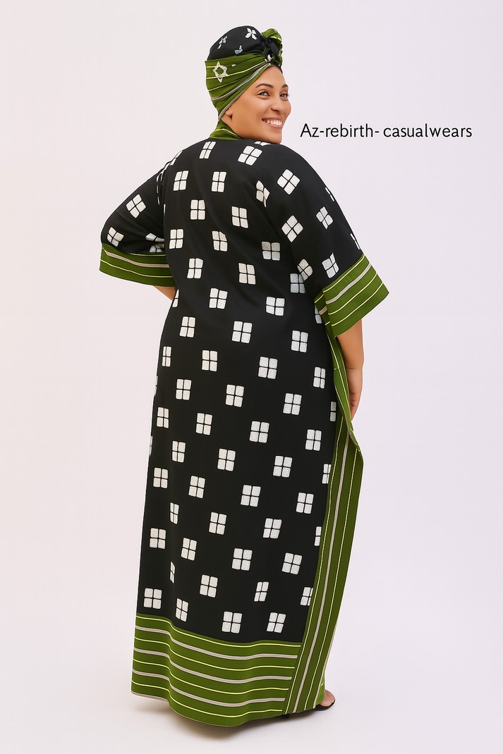 Ce magnifique boubou est confectionné avec un mélange raffiné de deux tissus africains traditionnels : l’Aso Oke vert rayé utilisé pour les bordures, et le tissu noir Kampala avec motifs blancs.