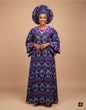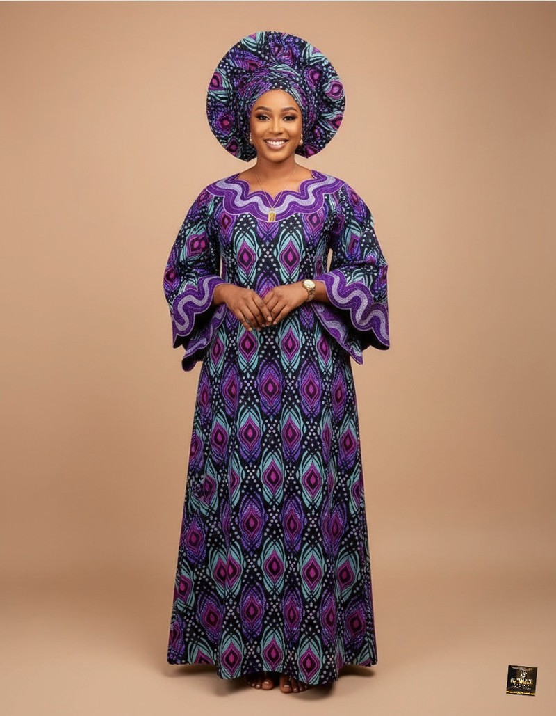 Radiant and hypnotic, this full-length African print gown is a breathtaking spectacle of color, dominated by a bold, repeating pattern of intricate diamond and eye-like motifs in luxurious shades of amethyst purple, vibrant violet, and cool teal against a deep navy background. The dress maintains an elegant, flowing silhouette and is exquisitely detailed with unique finishing touches: the neckline is beautifully trimmed with a scalloped, metallic-finish border that enhances the bustline, while the three-quarter length bell sleeves mirror this detailing with scalloped cuffs, creating a graceful, undulating line. The strong geometric print and rich jewel tones make this dress a true standout piece, perfect for pairing with the magnificent, expertly-tied matching gele (head-tie) for high-impact appearances at weddings, cultural events, or any formal celebration.