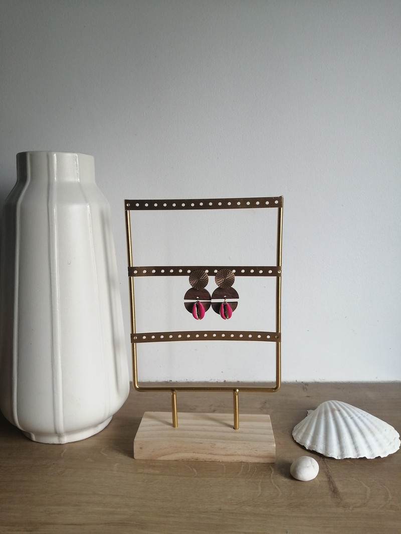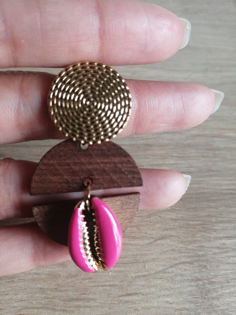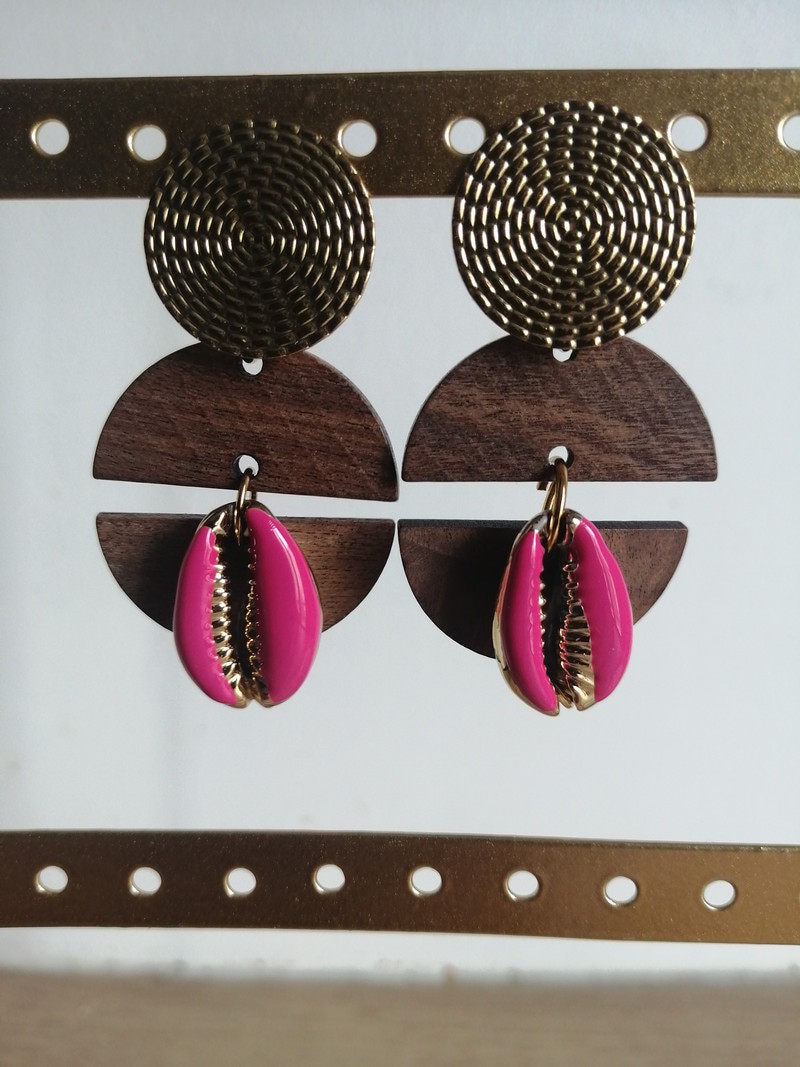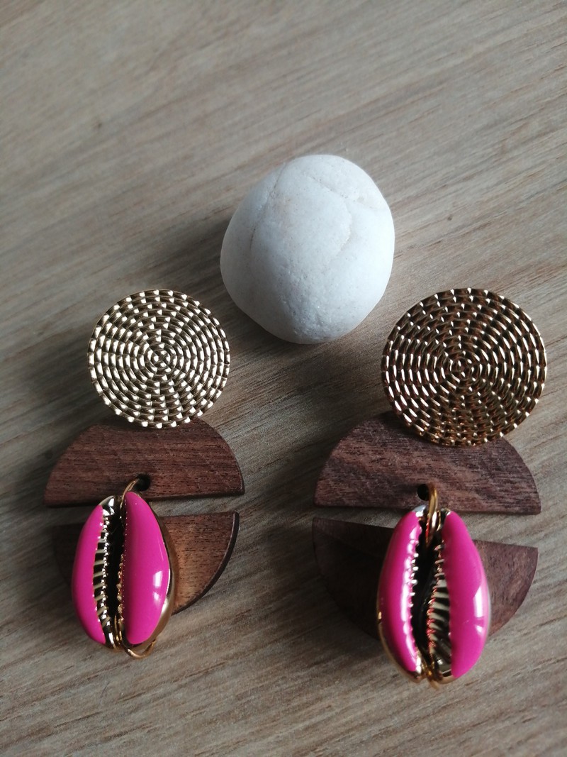 Paire de boucles d'oreilles " Carbet Fuchsia " by Lambi et Cauri composée d'un clou aspect tressé en acier inoxydable doré de 2 cm de diamètre, de 2 pendentifs en bois en forme de demi-cercle et d'un un cauri Fuchsia . Taille approximative 5 cm.