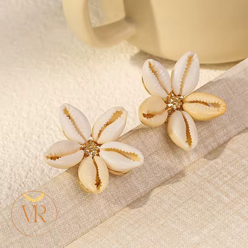 Ces boucles d’oreilles en forme de fleur sont réalisées à partir de coquillages cauris, symboles ancestraux de richesse, de féminité et de protection dans de nombreuses cultures africaines. Chaque pétale de cauri forme une corolle autour d’un centre doré texturé, créant une pièce à la fois naturelle, élégante et spirituelle.