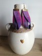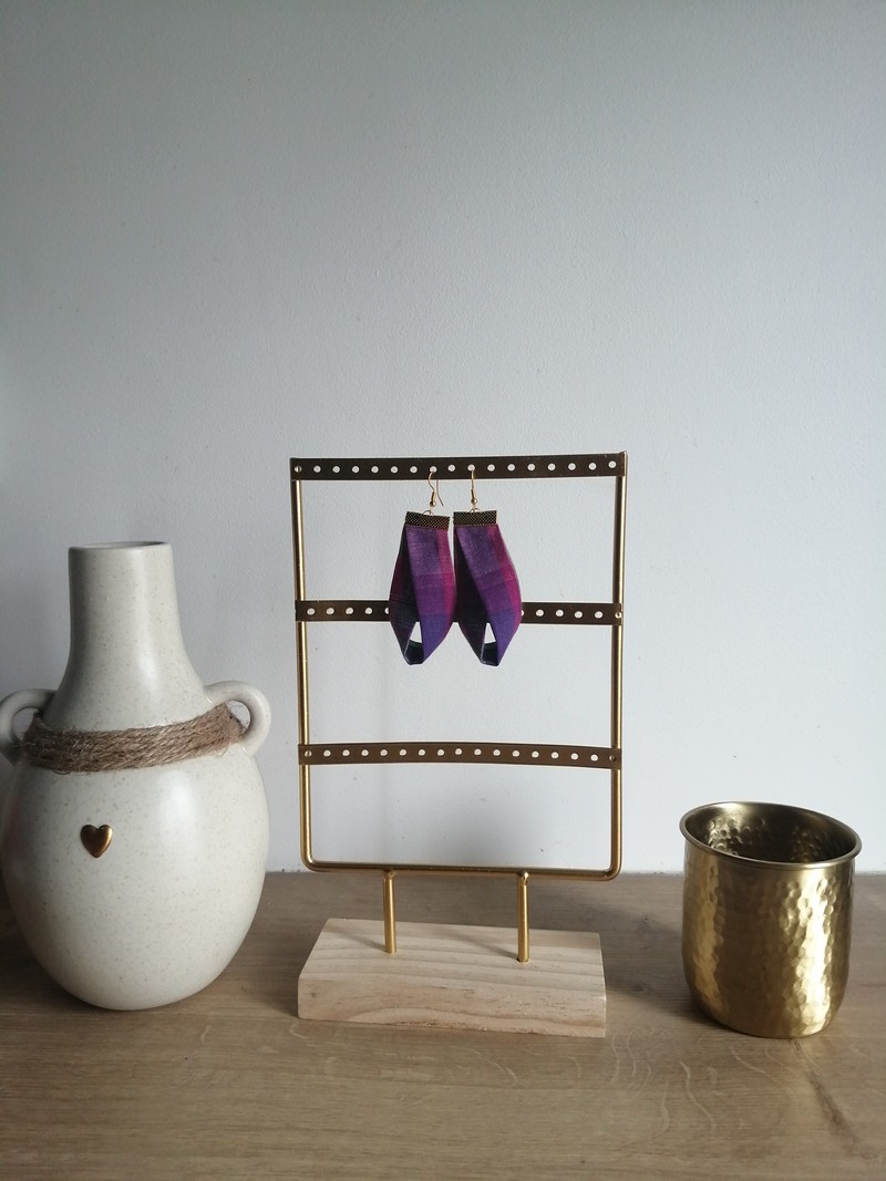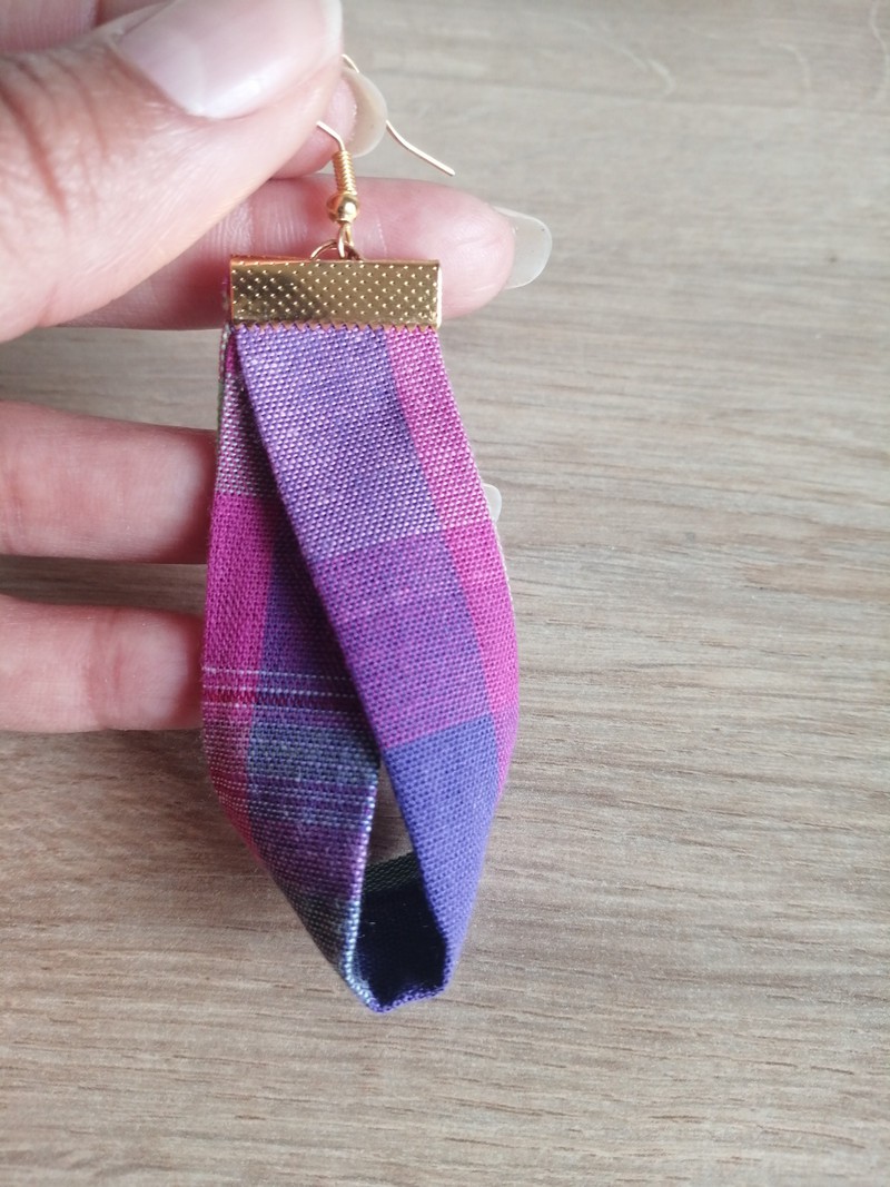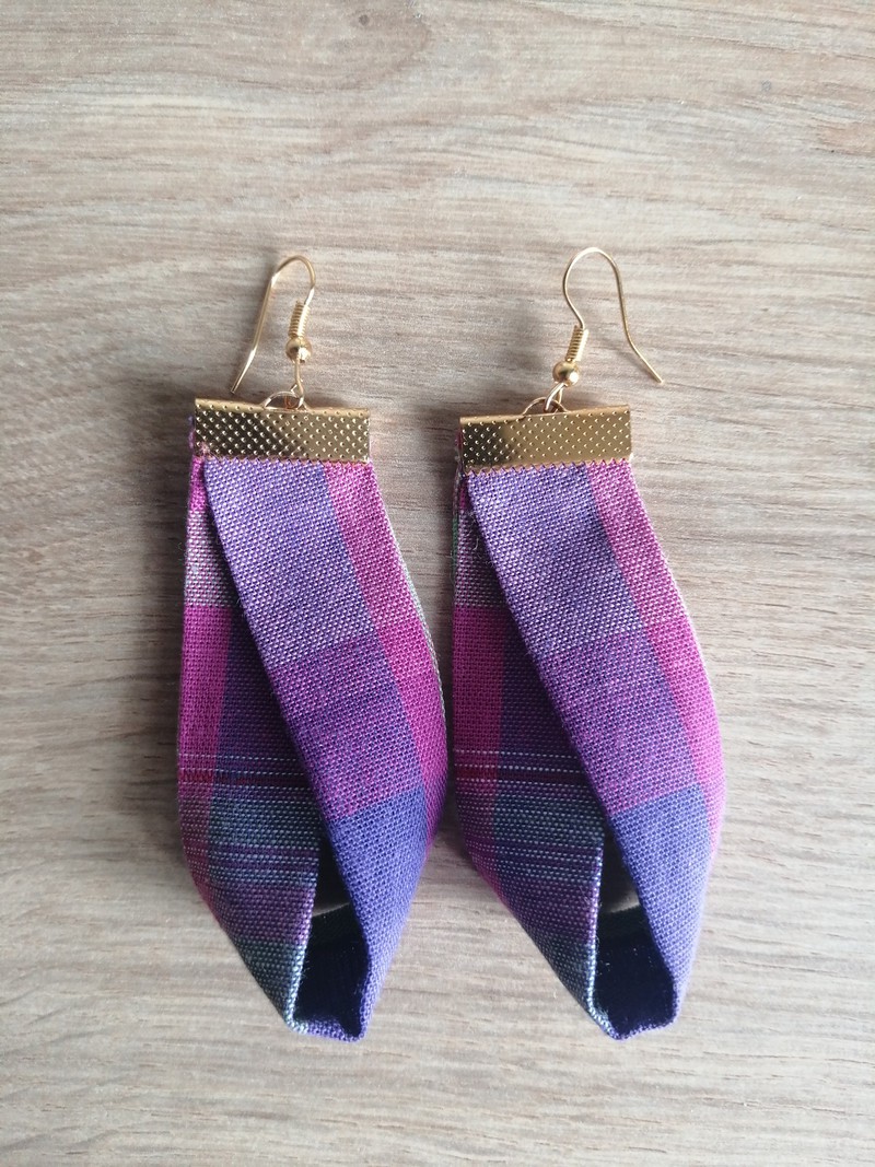 Paire de boucles d'oreilles "La Baie-Mahaultienne " by Lambi et Cauri en forme de goutte en tissu Madras violet à grands carreaux. Taille approximative 10 cm Fait main