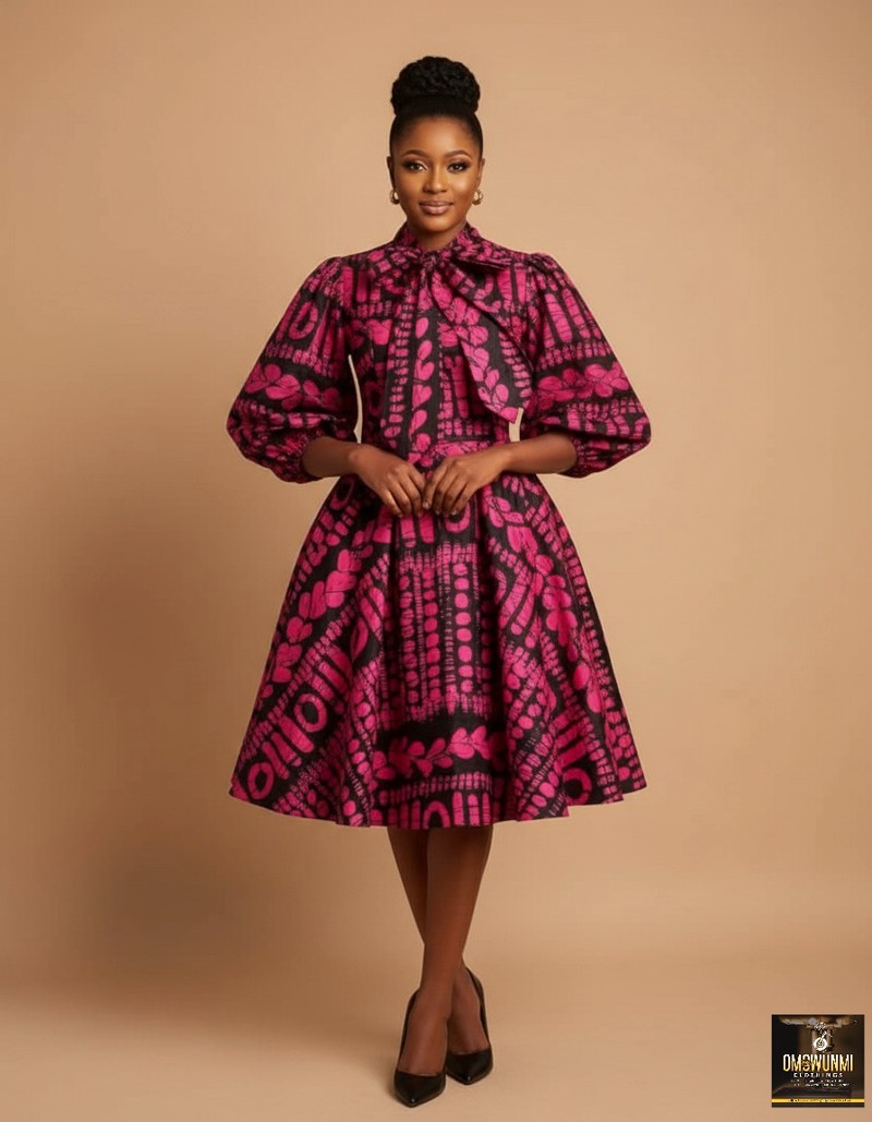 Command attention with timeless elegance in our pink and black Bow Collar Dress. Crafted from premium Ankara fabric, this dress features a structured flare silhouette that flatters every figure. The voluminous puff sleeves and a dramatic bow-tie neckline add a sophisticated, feminine touch. The bold pink and black print gives this piece a luxurious statement feel ideal for special occasions, weddings, church events, or formal lunches. Style Tips: Pair with classic black heels or sneakers or slides and gold or silver accessories for a polished finish. Material: Ankara Color: Multicolor Fabric: 100% Cotton Ankara Fit:Structured / True to size Care:Dry clean recommended A $45 shipping fee applies to all international orders (France,Germany, China etc) to cover customs and clearance charges. UK and US shipping costs will be covered by us. Kindly note that all orders are processed and shipped within 5–7 business days.