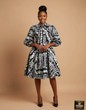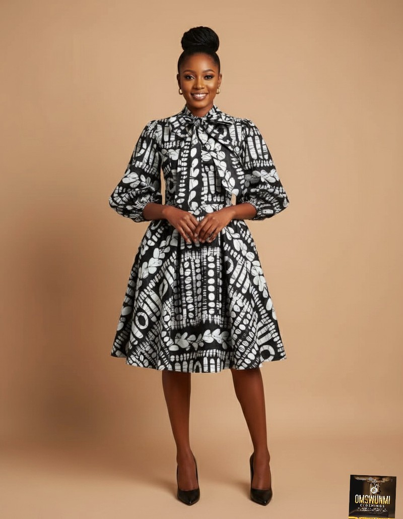 Command attention with timeless elegance in our black and white Bow Collar Dress. Crafted from premium Ankara fabric, this dress features a structured flare silhouette that flatters every figure. The voluminous puff sleeves and a dramatic bow-tie neckline add a sophisticated, feminine touch. The bold black and white print gives this piece a luxurious statement feel ideal for special occasions,weddings, church events, or formal luncheons.