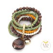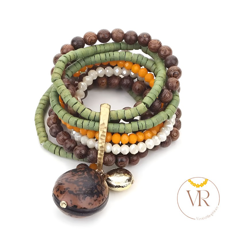 Composé de perles en bois, résine et éléments dorés, il s’enroule élégamment autour du poignet. Son pendentif en graine naturelle apporte une touche d’authenticité et de caractère, faisant de ce bijou un accessoire à la fois artisanal et moderne.