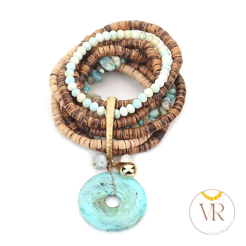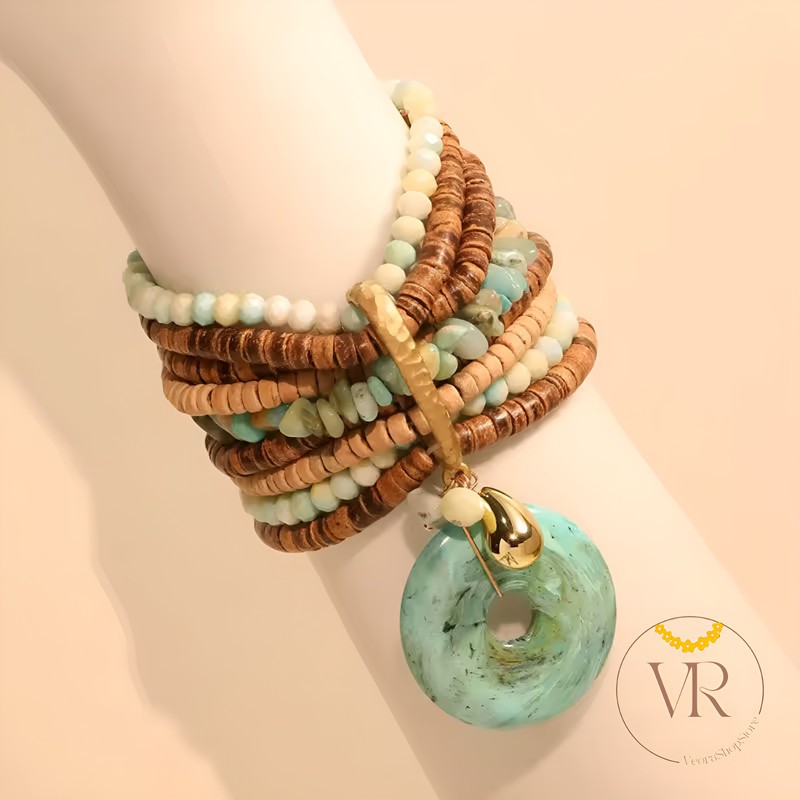 Ce bracelet multi-rangs est inspiré des parures artisanales africaines, où chaque élément reflète un lien profond avec la terre et la nature. Ses perles en bois, ses touches de vert et son pendentif circulaire rappellent l’équilibre, la fertilité et la continuité de la vie, valeurs universelles célébrées dans de nombreuses cultures africaines.