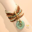 Composé de perles en bois, résine colorée et éléments dorés, il s’enroule naturellement autour du poignet. Son pendentif circulaire vert marbré, rehaussé d’un détail doré, en fait une pièce forte qui mêle authenticité et élégance contemporaine.