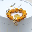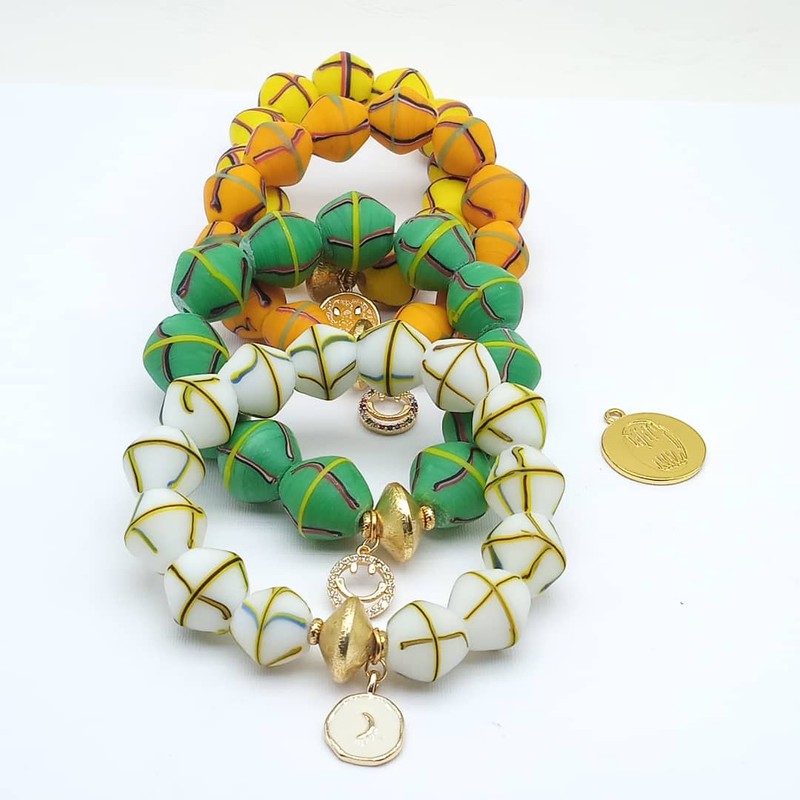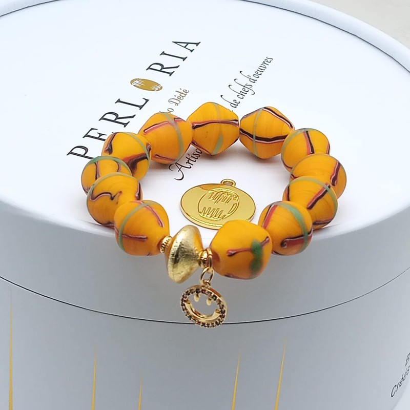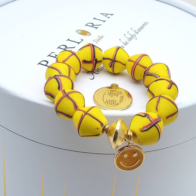 Bracelet en perles anciennes dénommé "HEGO", associé de breloques smiley de différentes coloris