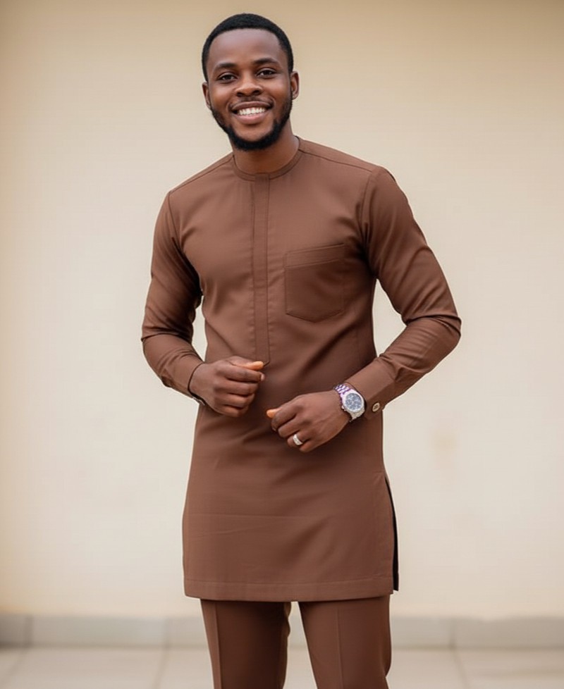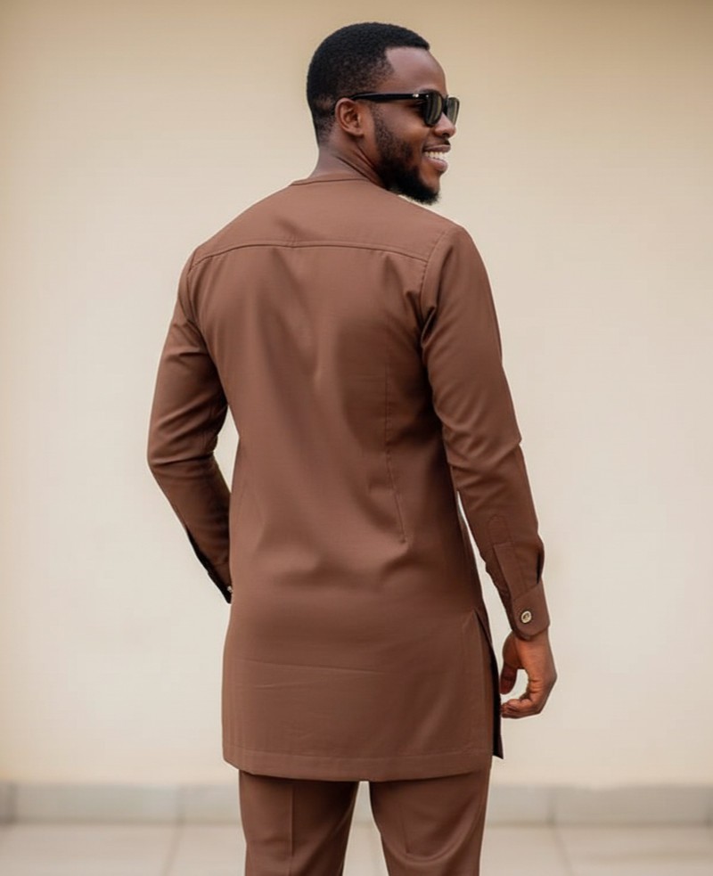 Achieve an effortlessly refined look with this Rich Brown (Chocolate) Two-Piece Senator Suit. The clean, tailored design features a long-sleeve tunic top with a subtle band collar and classic front placket detail, paired with perfectly matched fitted trousers. The deep, earthy tone offers a versatile and sophisticated style, perfect for business meetings, semi-formal gatherings, and cultural events. Style Name: Classic Senator Suit / Tunic Set / African Two-Piece Material: High-Quality Cotton Blend / Premium Suiting Fabric Color: Rich Brown / Chocolate (Warm, earthy tone) Design: Long-sleeve Tunic Top with Band/Mandarin Collar; Clean Front Placket; Single Chest Pocket; Matching Tailored Trousers Occasion: Business, Semi-Formal Events, Church, Cultural Ceremonies, Engagements Gender: Men's Set Includes: 1x Long-Sleeve Tunic Top; 1x Matching Trousers Fit Note: Modern Tailored/Slim Fit Care Instructions: Dry Clean or Machine Wash Gentle Recommended