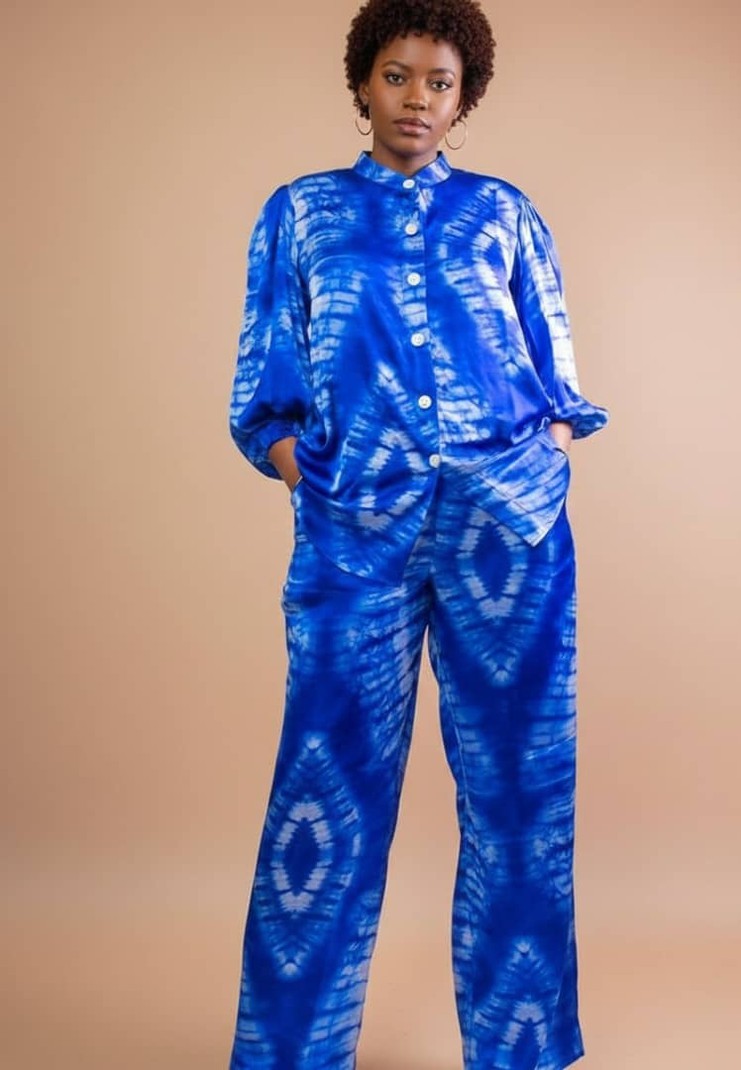 This sophisticated two-piece pleated set is meticulously crafted from a high-quality, lightweight plissé fabric that offers a unique textured finish and exceptional natural stretch for a flattering, comfortable fit. The ensemble features a classic button-down long-sleeved shirt paired with elegant high-waisted wide-leg trousers, both adorned with a dreamy, ethereal hand-dyed adire pattern in soft sky blue and warm ochre tones. This versatile set is an ideal choice for a chic coastal getaway, a sophisticated garden brunch, or an elevated creative workspace where you want to project a look of effortless, modern luxury.