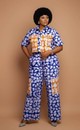 This eye-catching two-piece set is meticulously crafted from premium, high-density cotton that offers a crisp, structured feel while ensuring maximum breathability for all-day comfort. The ensemble features a short-sleeved, cropped button-down shirt with a classic collar and bold patch pockets, paired with coordinating high-waisted wide-leg trousers that create a modern, balanced silhouette. The garment is defined by a striking geometric adire pattern in a vibrant royal blue and white palette, accented by strategically placed blocks of warm orange for a contemporary pop of color. This versatile set is an ideal choice for a creative professional workspace, a chic city brunch, or an upscale afternoon social event where you want to project a look of confident, modern elegance rooted in traditional craftsmanship.