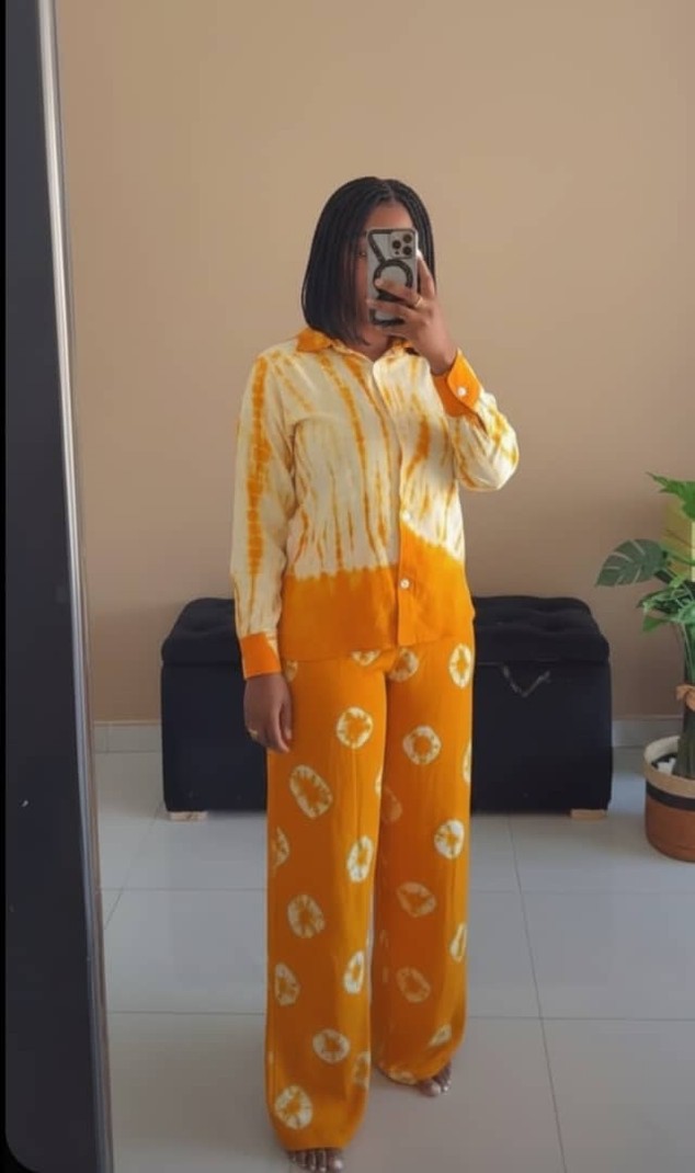This sophisticated two-piece set is meticulously crafted from premium, high-lustre cotton that offers a luxurious, fluid drape and a smooth feel against the skin. The ensemble features a relaxed-fit, long-sleeved button-down shirt paired with coordinating high-waisted wide-leg trousers, both showcasing a vibrant hand-dyed adire pattern in a striking bicolour orange and white palette. This versatile outfit is an ideal choice for a sophisticated garden brunch, an upscale travel lounge, or a creative professional setting where you want to radiate effortless, culturally-inspired elegance.