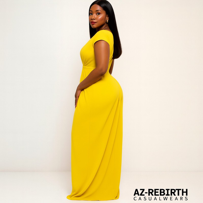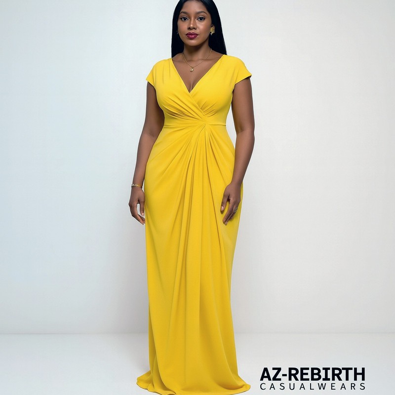 Adoptez l’élégance avec cette robe longue jaune à manches courtes, dotée d’un col en V flatteur et de plis drapés tombant délicatement depuis la taille. Le corsage ajusté sublime votre silhouette tandis que la coupe longue effleure le sol avec fluidité. Idéale pour les mariages, galas et soirées élégantes. Disponible dans toutes les tailles.