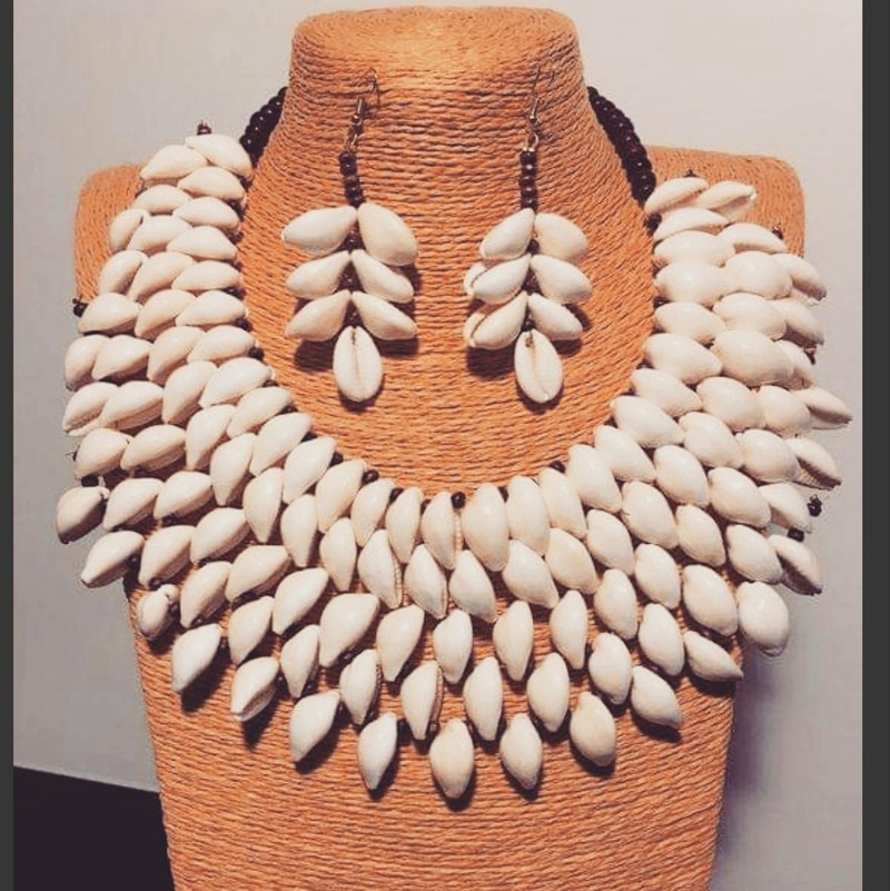 Parure ensemble collier 5 tours et boucles d'oreilles en Cauris fait main fabriqué artisanalement au Bénin.