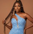 It features a one-shoulder neckline and a high thigh slit.