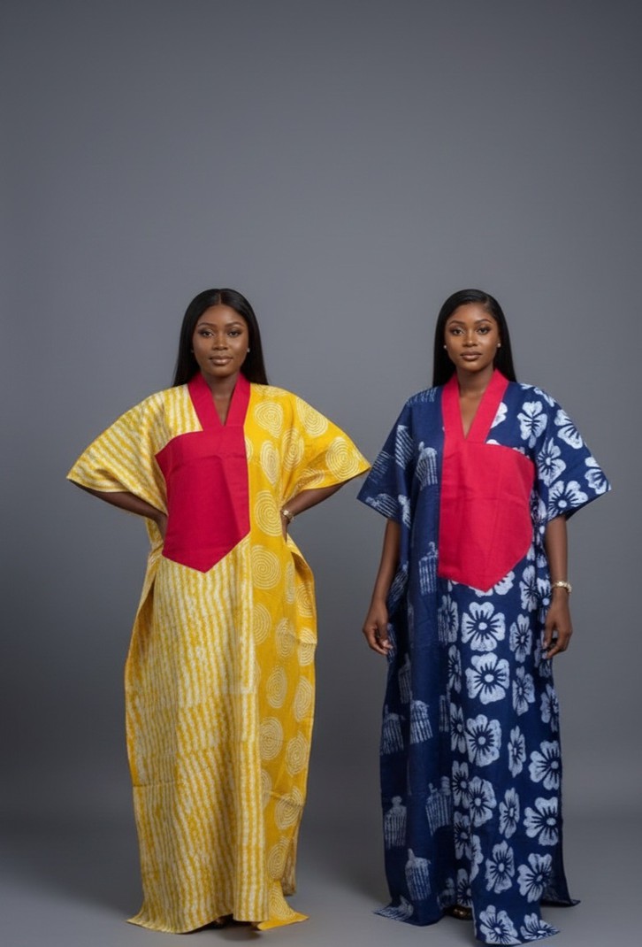 - **Left:** Yellow Kaftan with Unique Circular Patterns and a Bold Red Pocket