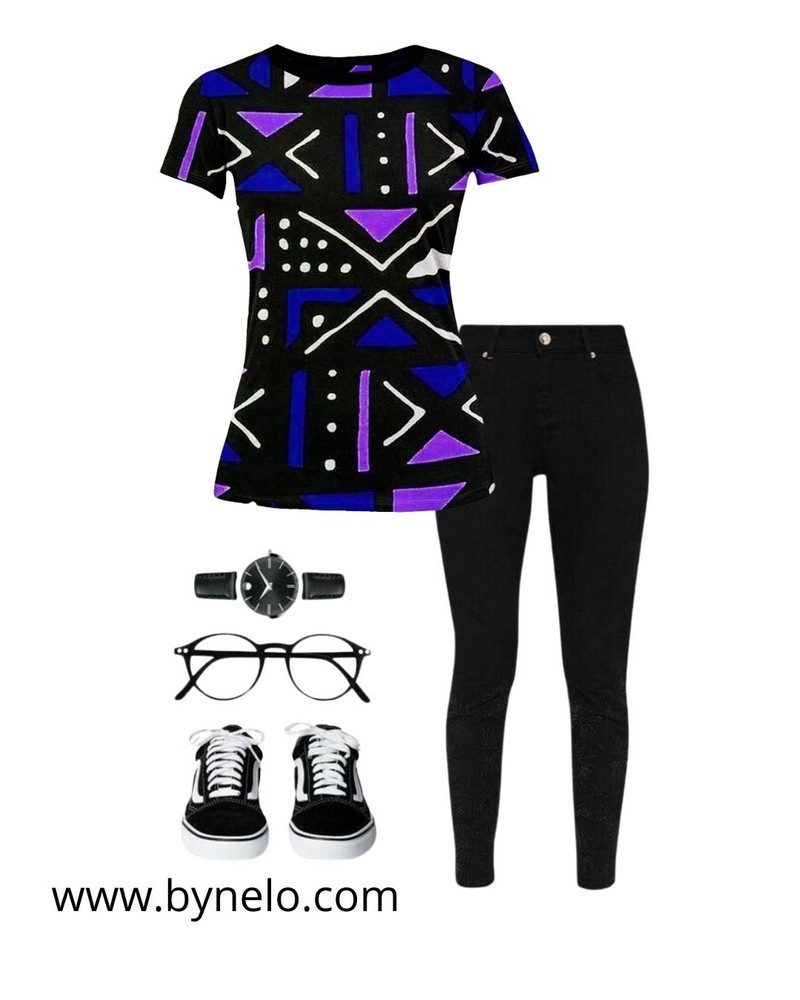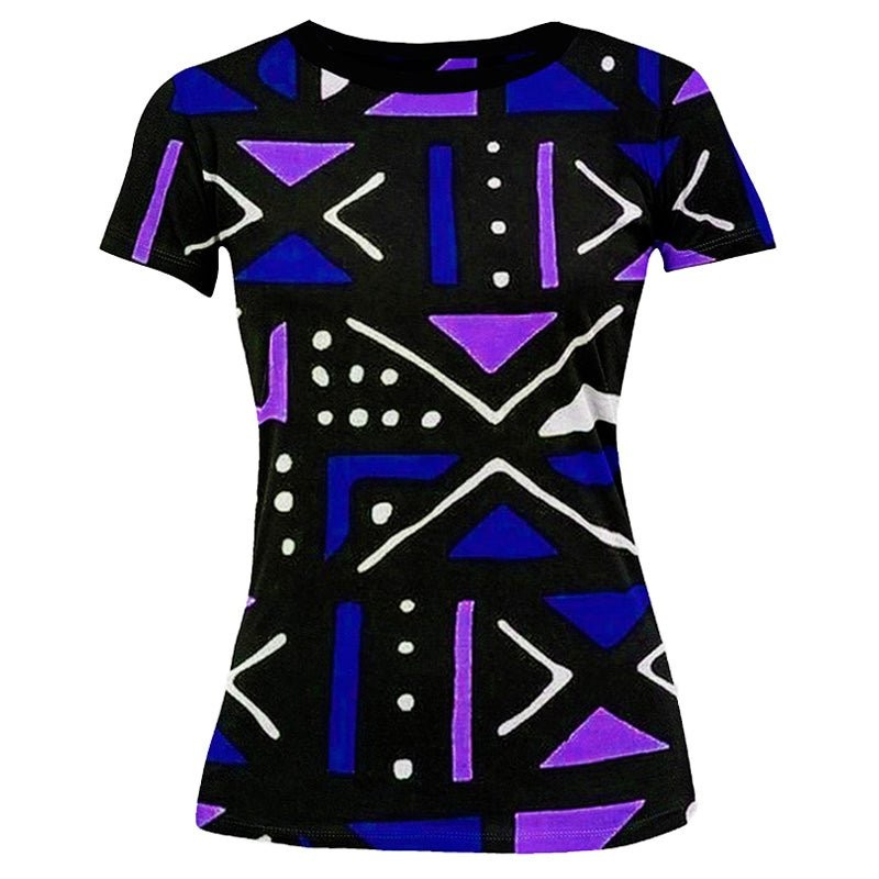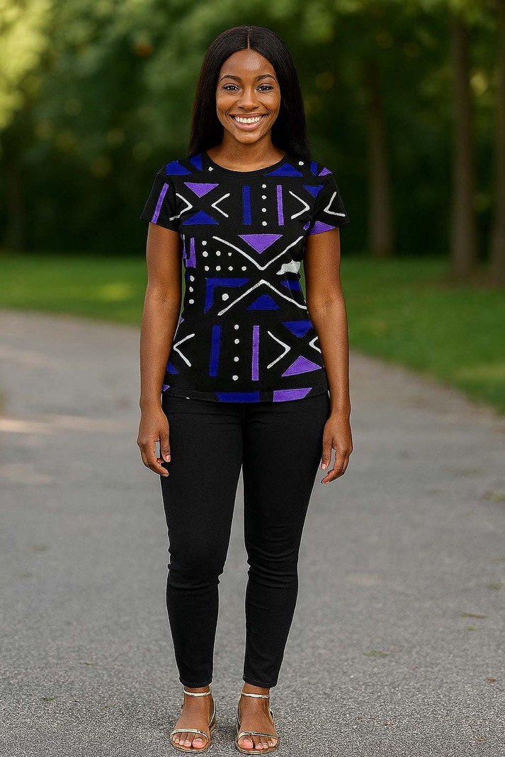 This Bogolan Print Women T-shirt is a unique, stylish top perfect for any fashion-forward wardrobe. It features a bold and bright bogolan print, and is crafted from lightweight and breathable fabric for a comfortable fit. Make a statement with this eye-catching shirt.