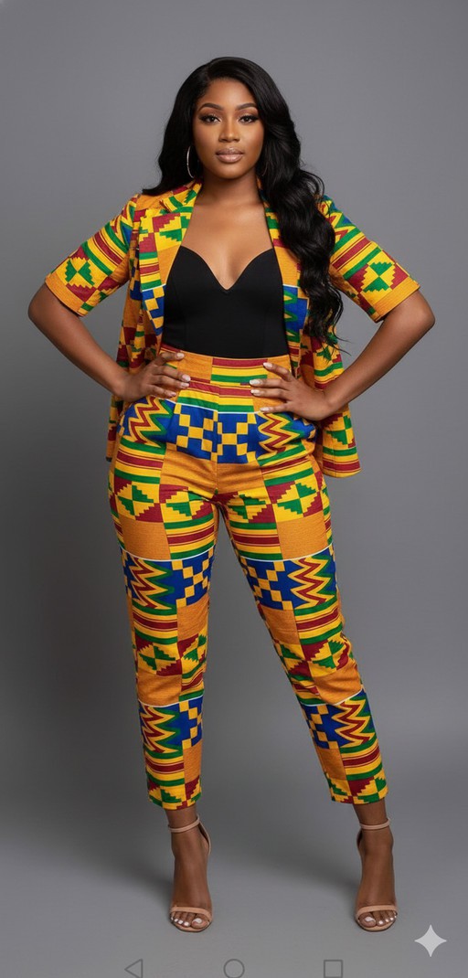 Elevate your wardrobe with our Chic Kente Print Blazer and Pant Set! This stylish two-piece features a tailored blazer with vibrant Kente patterns, paired with sleek matching pants. The combination of a fitted black top and bold prints creates a striking silhouette perfect for any occasion, from professional meetings to evening outings.