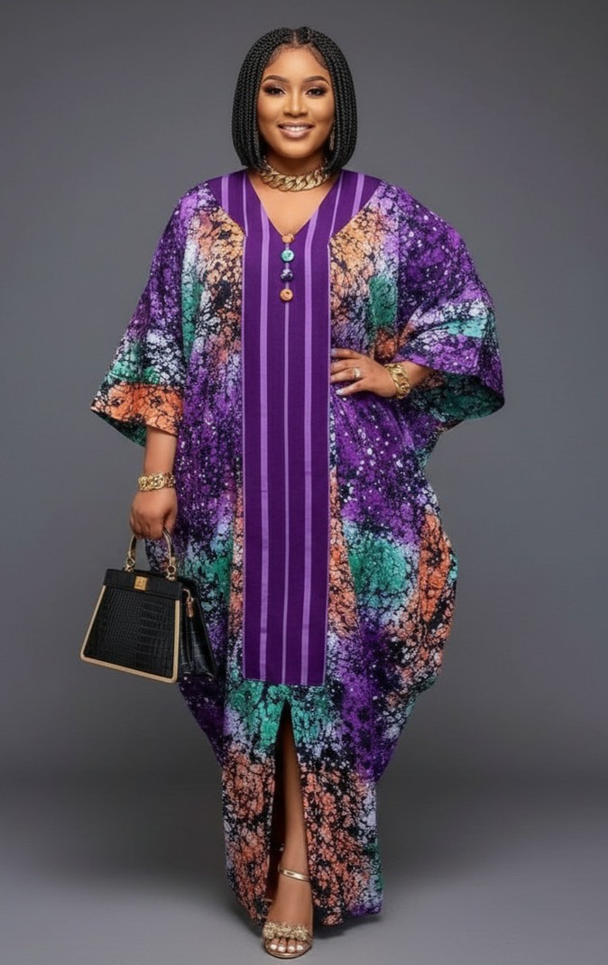 Step into style with our Vibrant Purple and Multi-Color Printed Kaftan Dress, a perfect blend of comfort and flair. This eye-catching dress features a beautiful abstract print in shades of purple, orange, and blue, complemented by elegant vertical stripes. The V-neck design and side slit add a touch of sophistication, making it an ideal choice for both casual wear and special occasions. Crafted from soft, lightweight fabric, this kaftan ensures all-day comfort while keeping you effortlessly chic. Perfect for every body type, it's a must-have addition to your