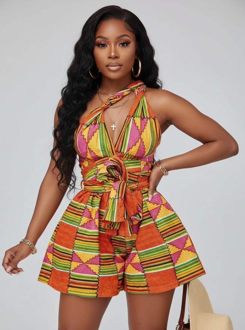 Unleash your vibrant style with our Chic Two-Piece African Print Set, perfect for those who love to make a statement. This stunning ensemble features a beautifully crafted top with a unique halter neck and playful tie, complemented by stylish shorts adorned with colorful geometric patterns.