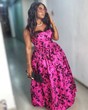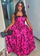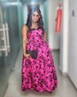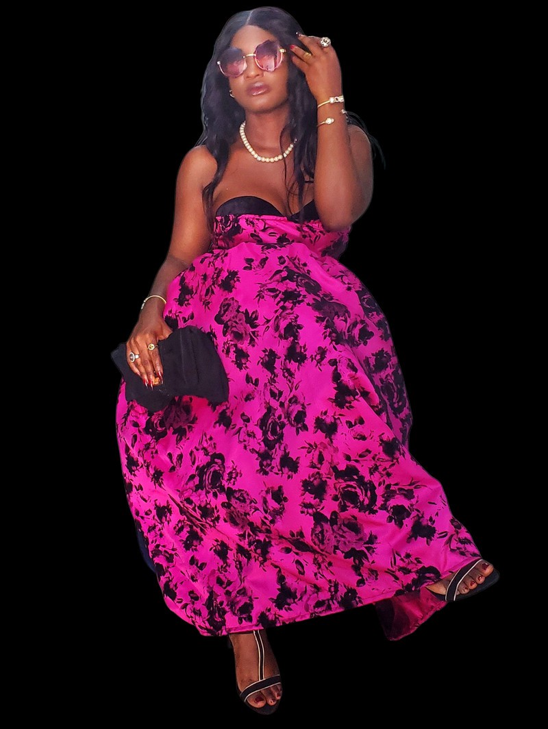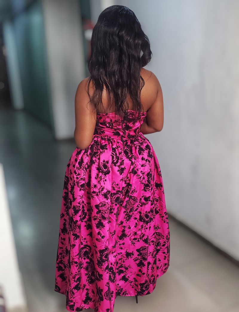 It is designed as a bustier long dress, not ankle-length (length can be made shorter at customer's request) featuring two side pockets and a back zipper. Velvet fabric is used to design the bust area of the dress.