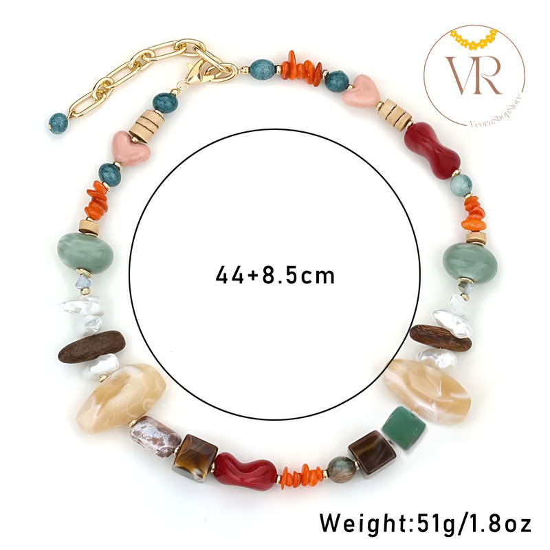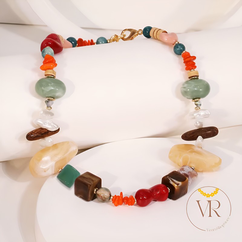 Composé de pierres naturelles colorées, de perles et de coquillages, il mêle les tons chauds et froids (rouge, vert, beige, bleu, orange) pour un rendu unique et vibrant.