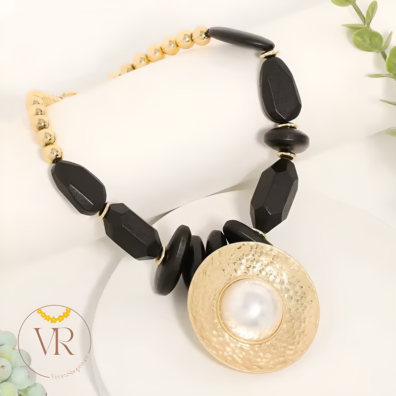 Conçu en perles en résine effet bois, alliage doré martelé et perle centrale nacrée, ce collier marie authenticité et raffinement moderne.